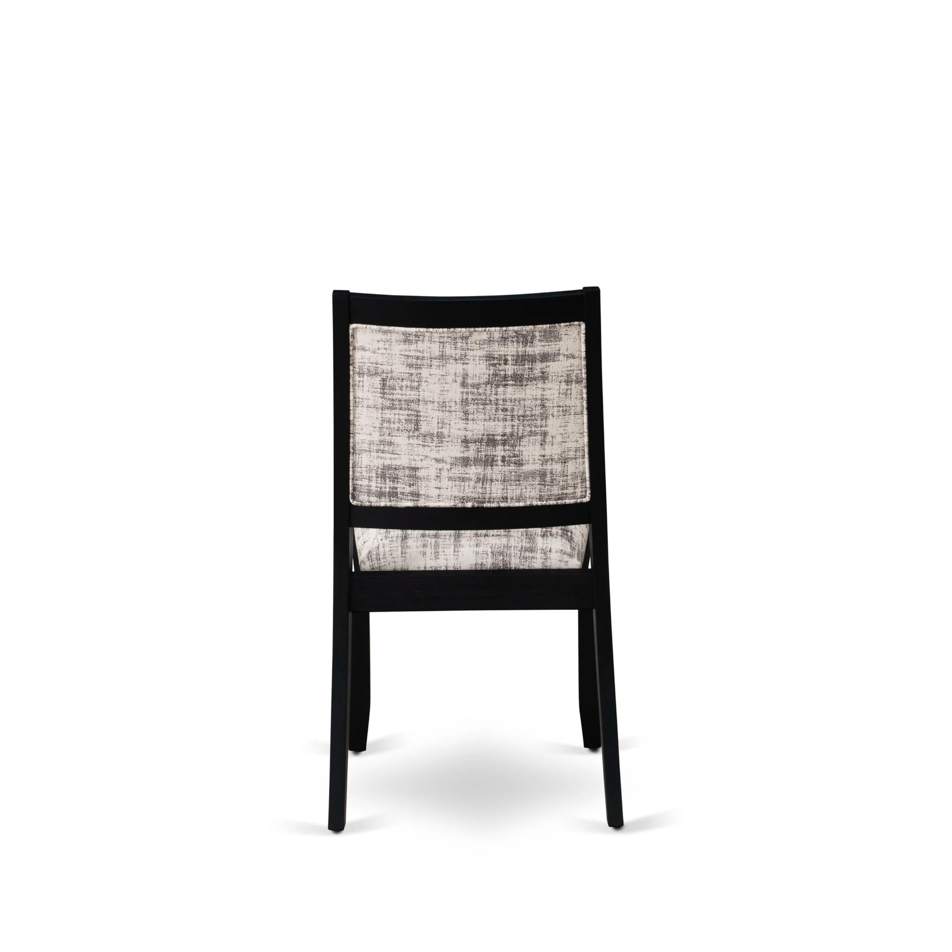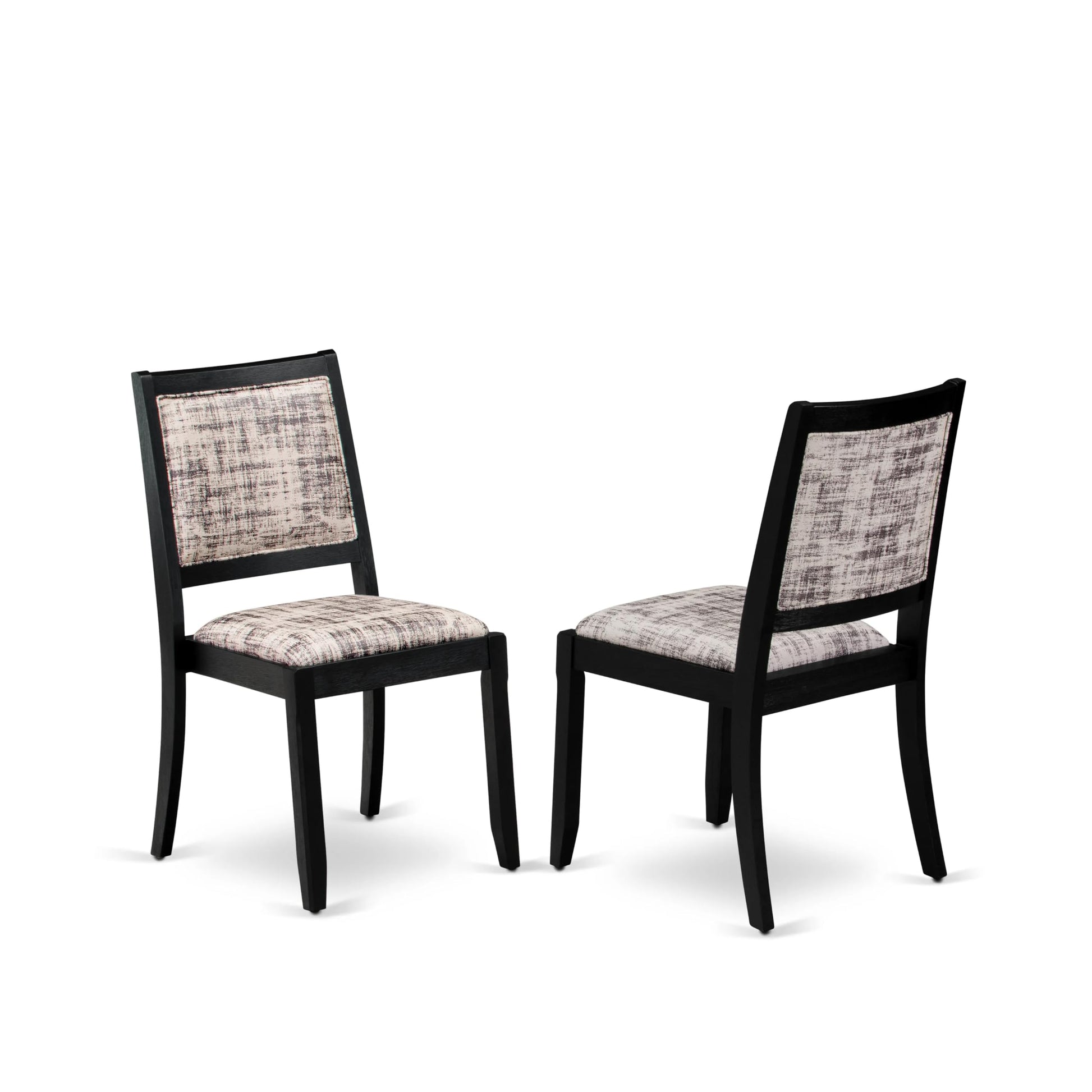 - KITCHEN TABLE SET FINISH: This kitchen table set comprises an elegant breakfast table with X-shaped legs finished in a sleek Wire Brushed Black, complemented by a Cement tabletop. The dining room chairs, designed for comfort and upholstered in White and Gray Pattern Faux Leather, seamlessly blend with the Wire Brushed Black legs, achieving a harmonious and sophisticated overall look in combination.