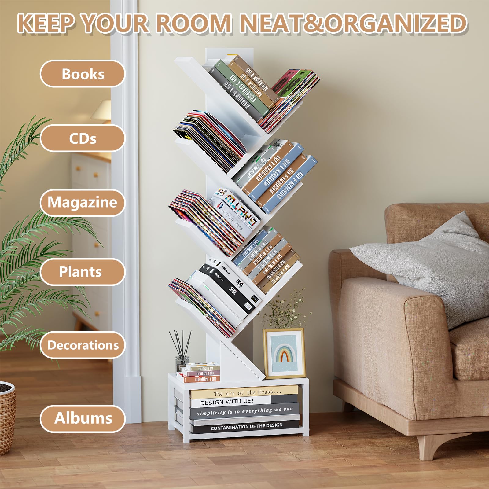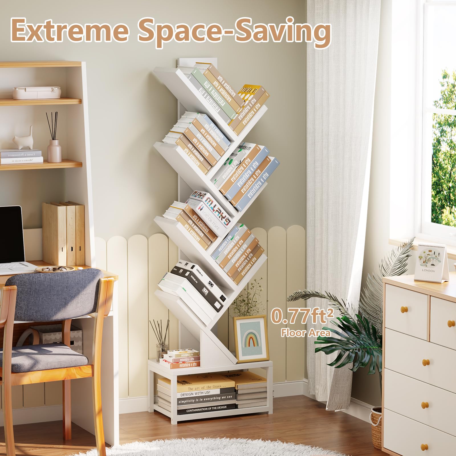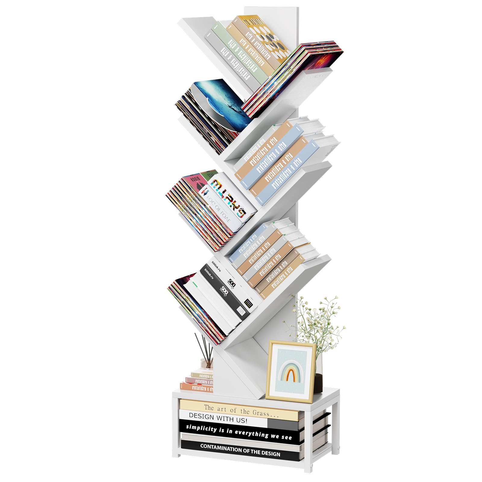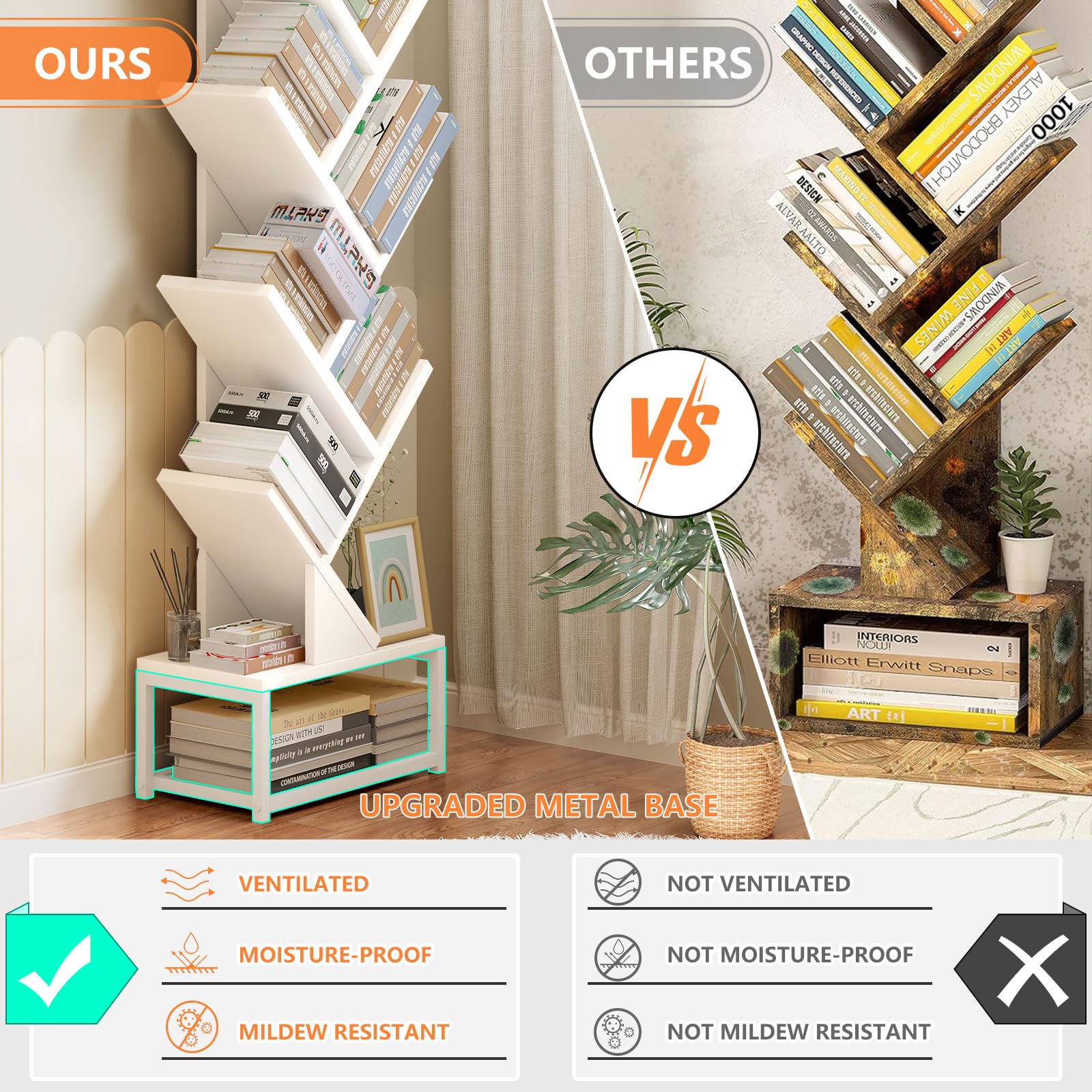 EasyCom Tree Bookshelf Metal Base, 7 Tier Bookcase Storage, Floor Standing Bookshelf Organizer for CDs/Books, Bookshelves for Bedroom/Living Room/Home Office, White