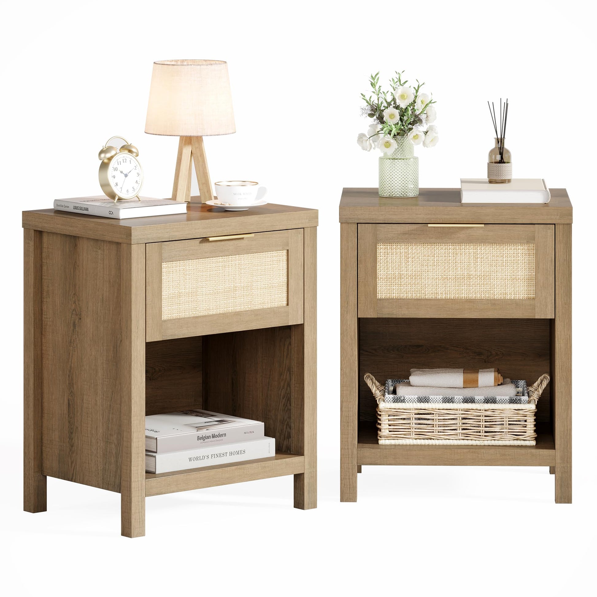 Rattan Nightstand Set 2: Boho End Table with Drawer and Storage Shelf, Farmhouse Cane