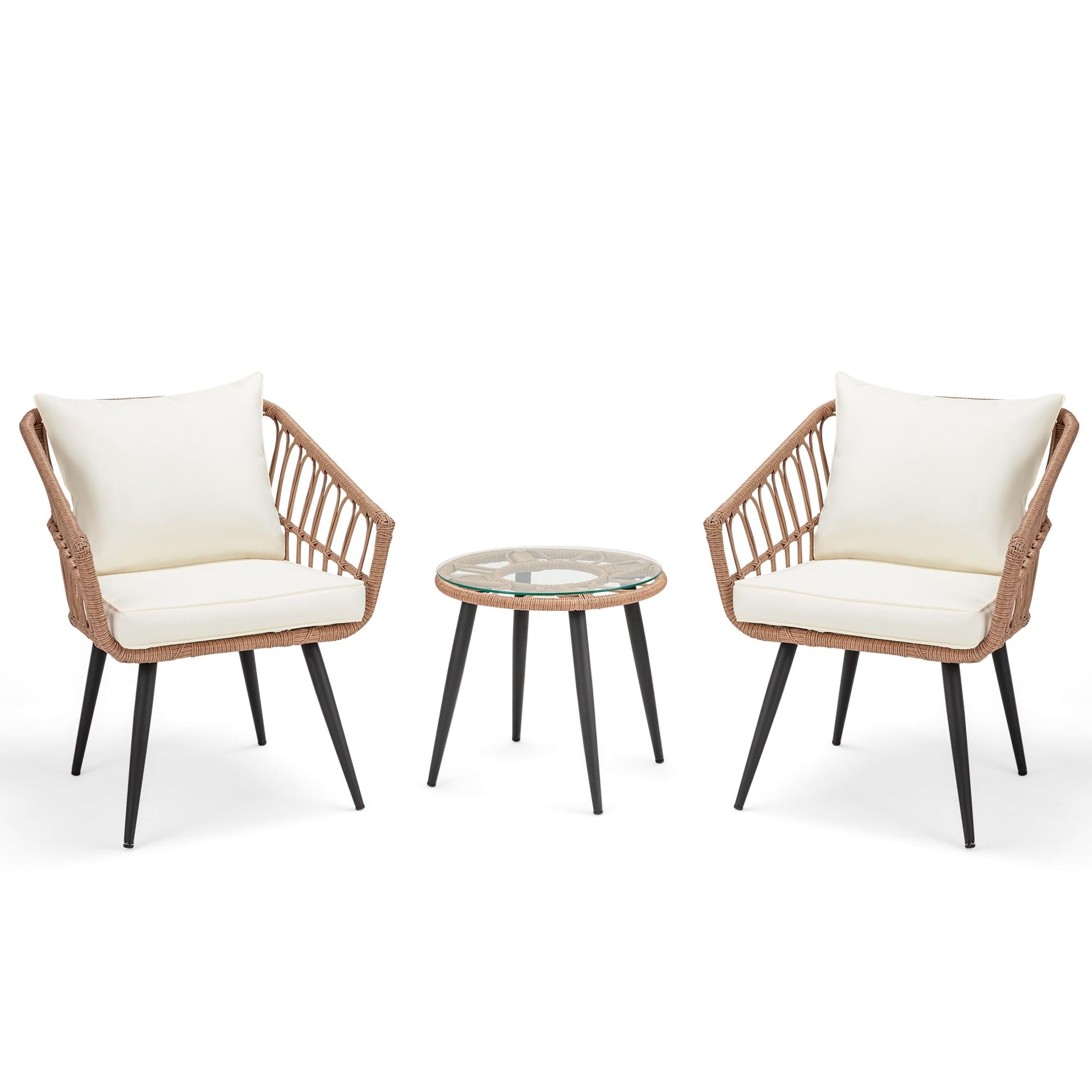 - 3 piece wicker bistro patio set will give your outdoor space a trendy feel with the natural wicker design and vintage vibes.The best part is the seat and back cushions already come with the chairs and cute coffee table. They come in a gorgeous ivory with grey color that looks good with everything.