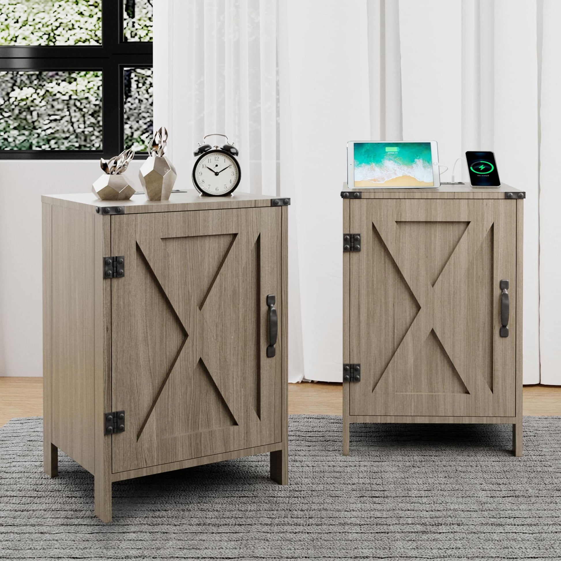 Farmhouse Nightstands Set of 2 with Charging Station, Wood Night Stands Bedside Table