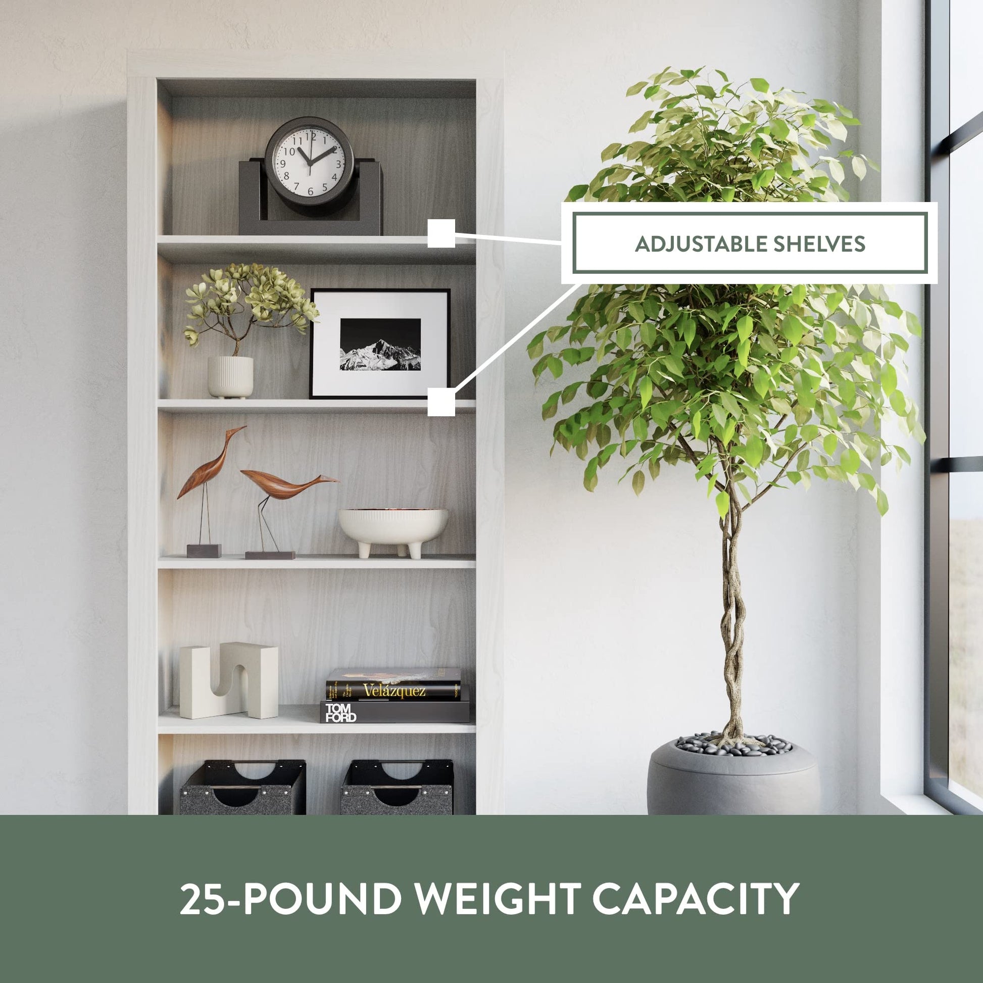 Details: A flexible storage shelf option with a rustic feel, this five-shelf bookcase is the perfect accent piece for your home. With durable laminate wood construction and an open design, these white shelves are the perfect place to store your favorite books, an overflow of office supplies, family photos, or a few of your favorite knickknacks. The top two shelves hold up to 25 pounds each and are adjustable to easily customize your storage organizer, while the bottom two shelves hold up to 35 pounds each and are secured to ensure sturdy and reliable support. Available in six colors, these shelves for bedroom, living room, or office storage offer versatility and match various design styles. Shipping to your door in one box, assemble this display shelf with a partner, and quickly have it ready to store your favorite items.