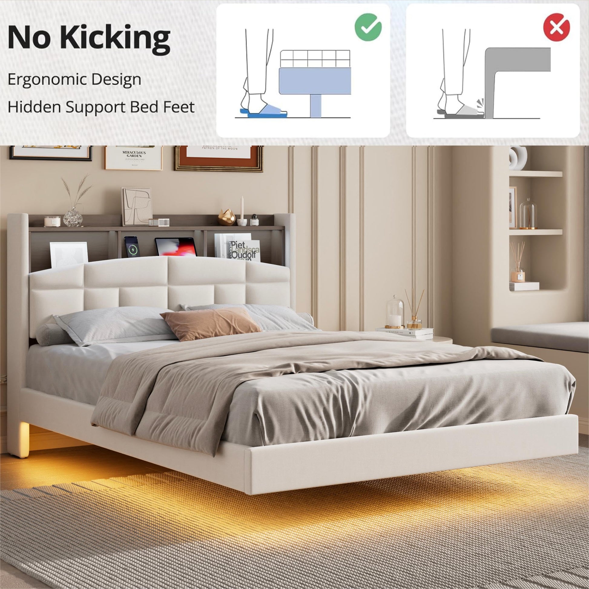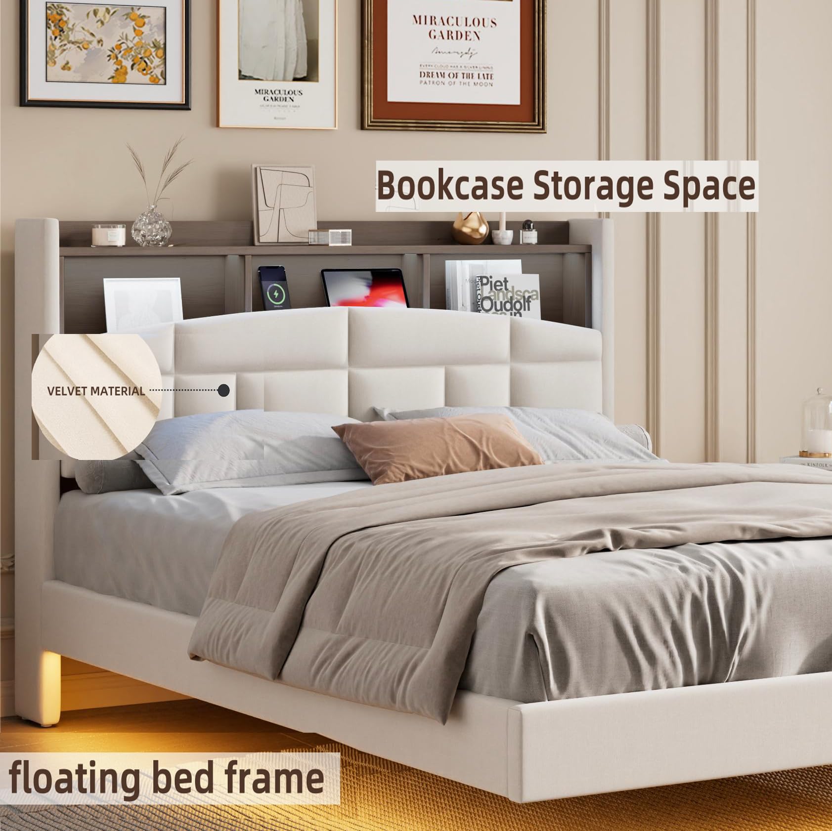 Floating Bed Frame with RGB LED Lights and Charging Station,Velvet Upholstered