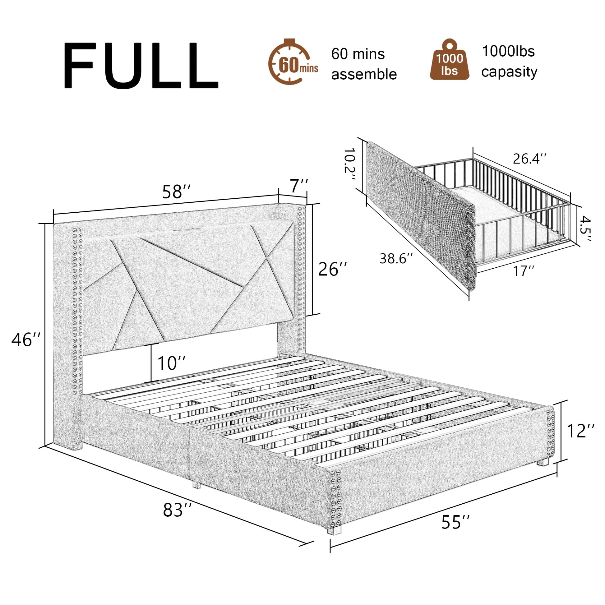 Size Full Product Dimensions 83"L x 55"W x 46"H Special Feature Wingback Headboard, Thicken Wooden Slats, Squeak Resistant Color Dark Grey Finish Type Painted