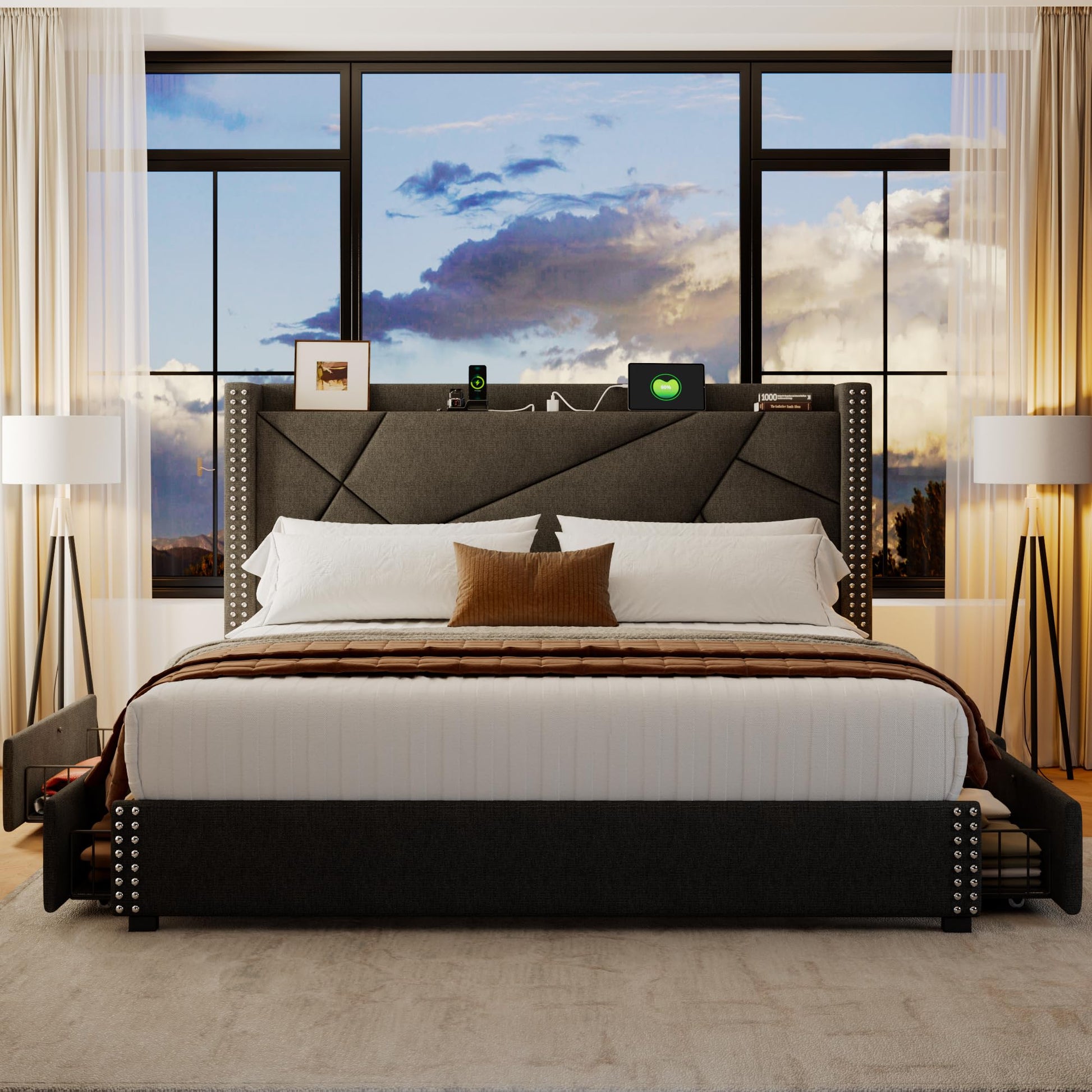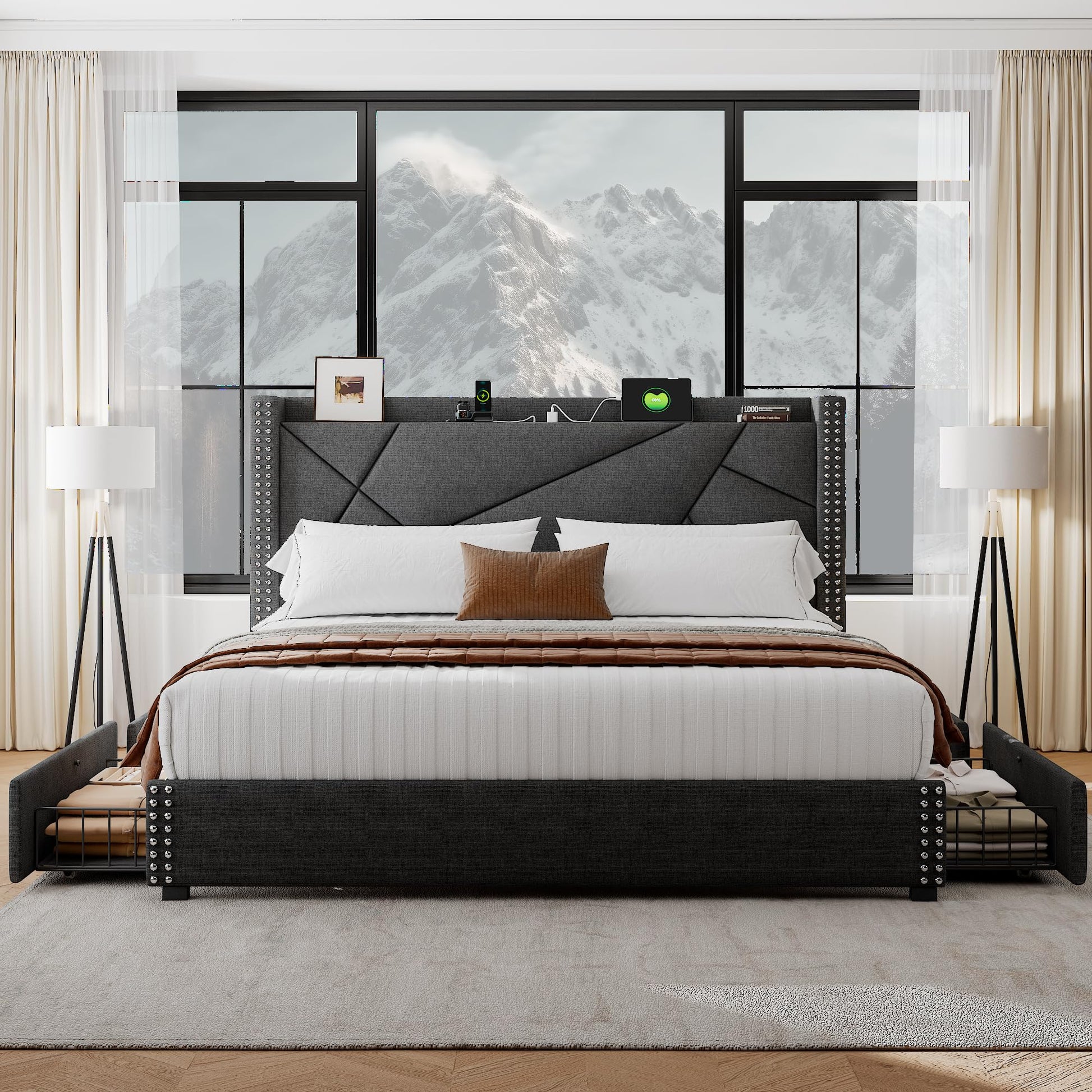 - Subtle Modern Style This bed frame embodies the sleek, minimalist aesthetic you crave, seamlessly blending pragmatism with artistic flair through its modern geometric wingback and storage headboard design. The vintage-style rivet decoration adds a unique charm to the bed frame