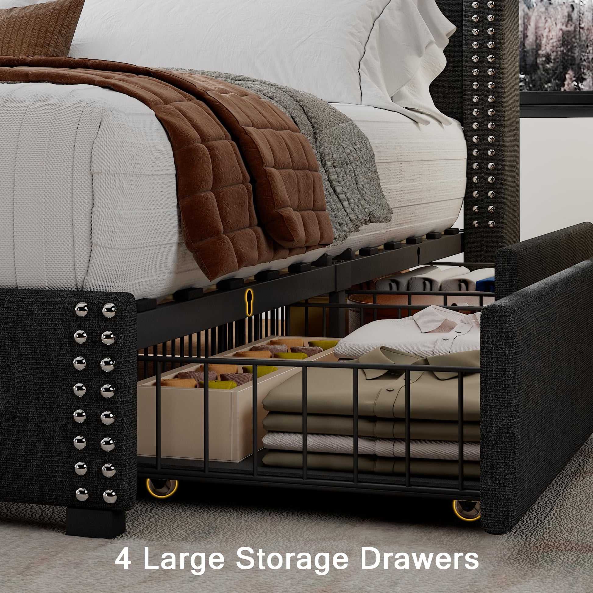 - Meticulous Bedroom Organizer: With four large storage drawers, the Einhorn storage bed is a perfect solution for maximizing space utilization, and keeping clothes and shoes neatly organized. The top of the headboard provides ample space for placing phones, books, and other small items