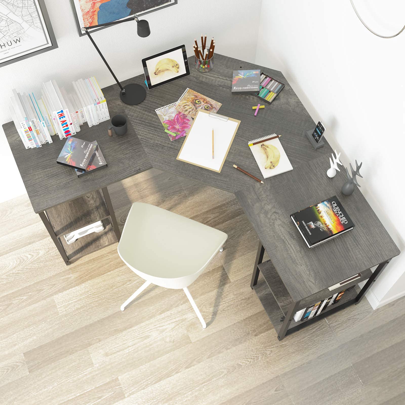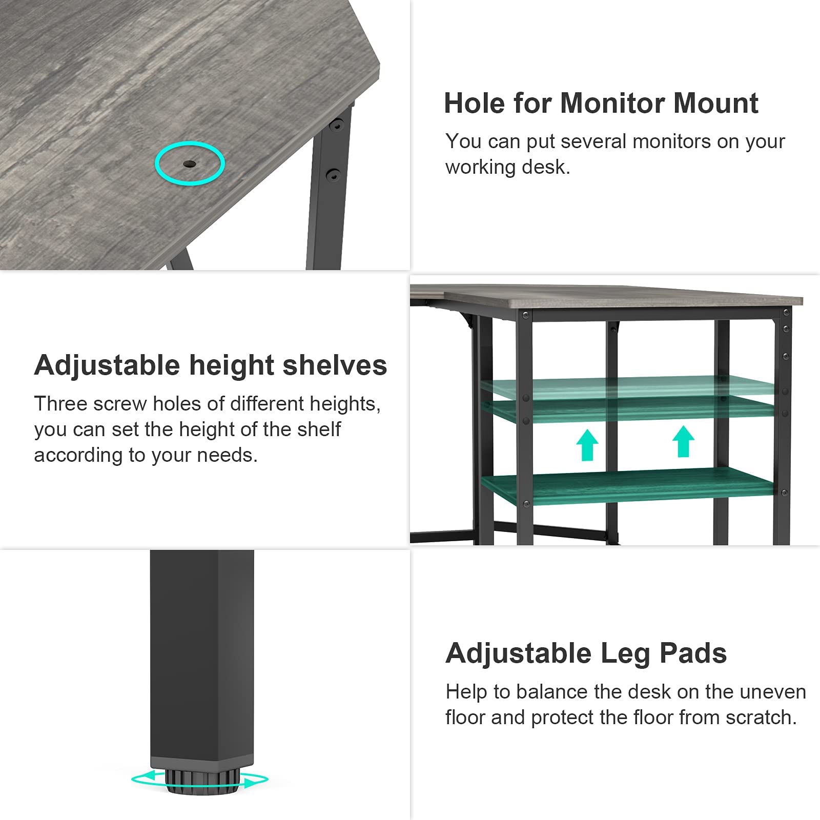 - This large L-shaped computer desk features two 2-tier open shelves for storage, providing plenty of surface space for your monitors, laptops or maybe other office supplies and organization.With three screw holes of different heights, you can set the height of the shelf according to your needs.
