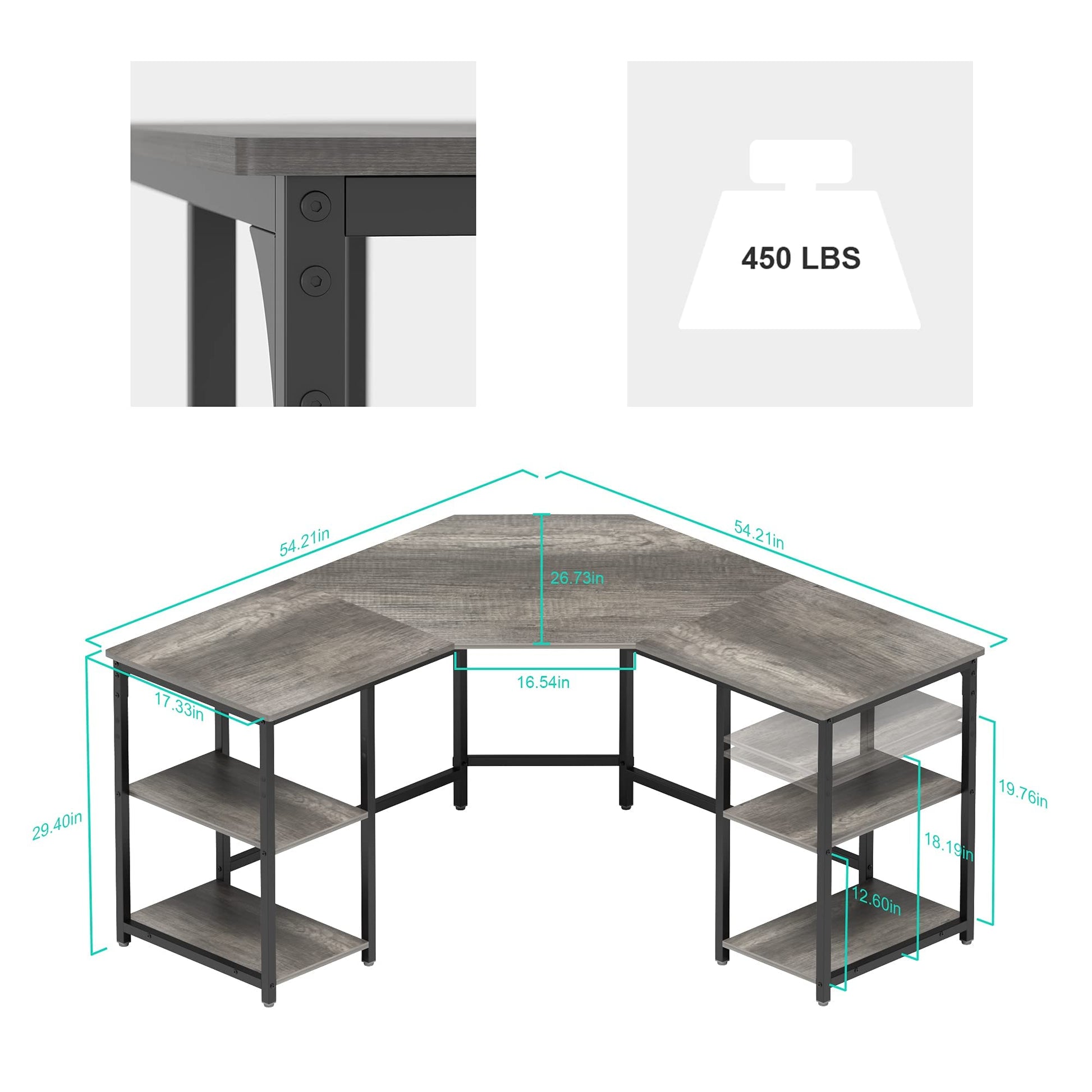 - (54.21+54.21) L x 17.33D x 29.4H inch, full L Shape design fits snugly in a corner to maximize your limited space. The beveled edge design in the middle provides more working space.