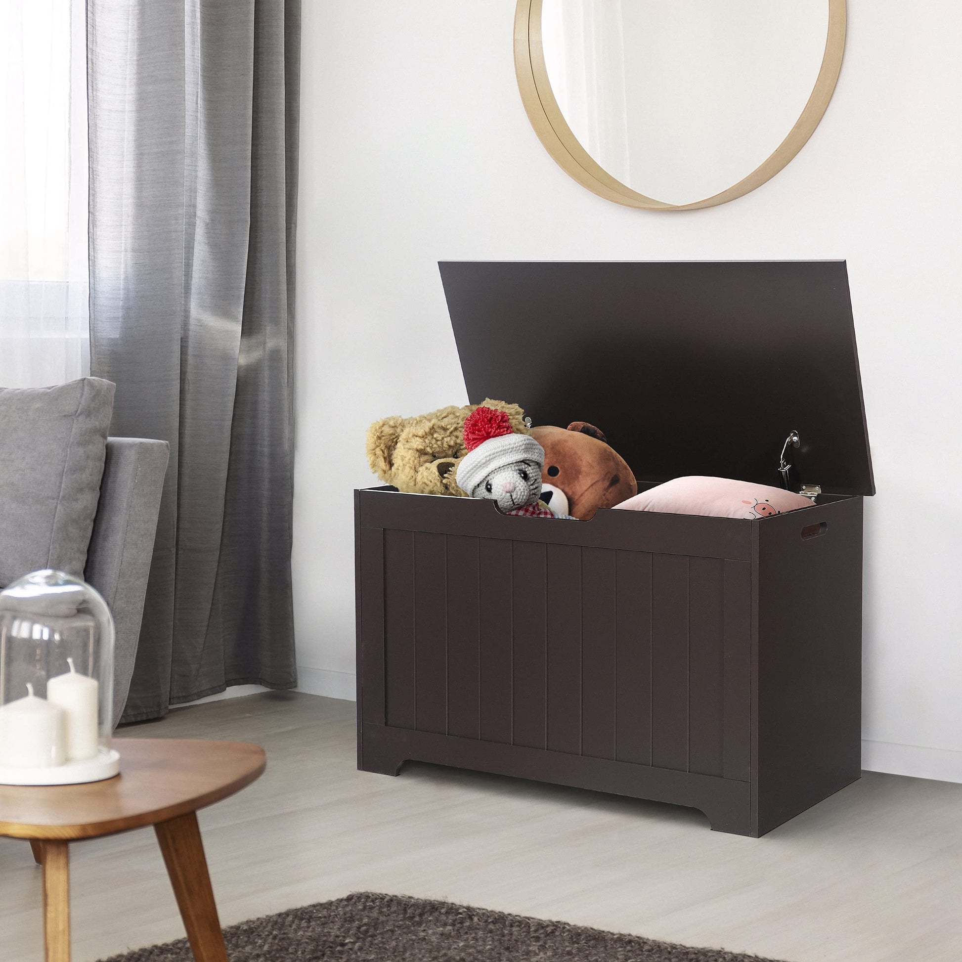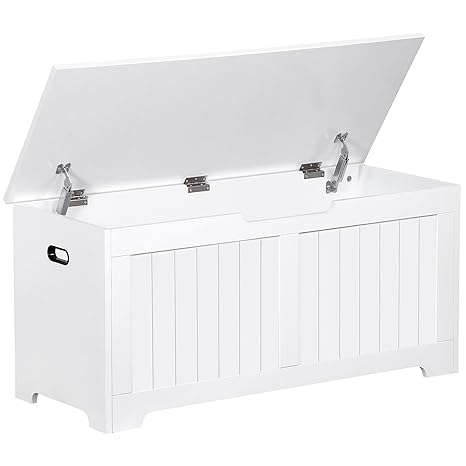 - Quality Made: Made of durable 13mm MDF board, the storage bench is strong and sturdy and looks absolutely comfortable with its rustic brown painted finish. Designed with children in mind, the lid's unique safety hinge prevents accidental dropping to help protect little fingers. Sturdy wood construction makes this this a lasting addition to any kid's room