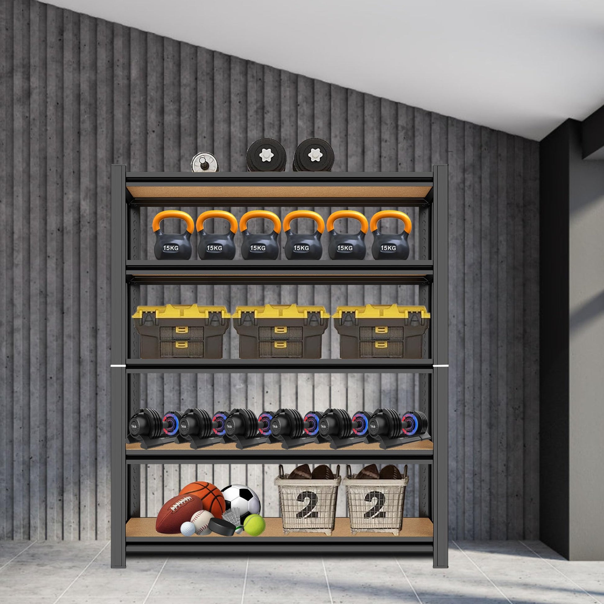 - Multipurpose Storage Shelves: The 5 shelves of this rack are all adjustable for getting items in different sizes well-settled.The garage shelves heavy duty shelving with perfect size is suitable for garage, pantry, closet, kitchen, warehouse, basement, living room, office, supermarket, commercial, school, library etc.