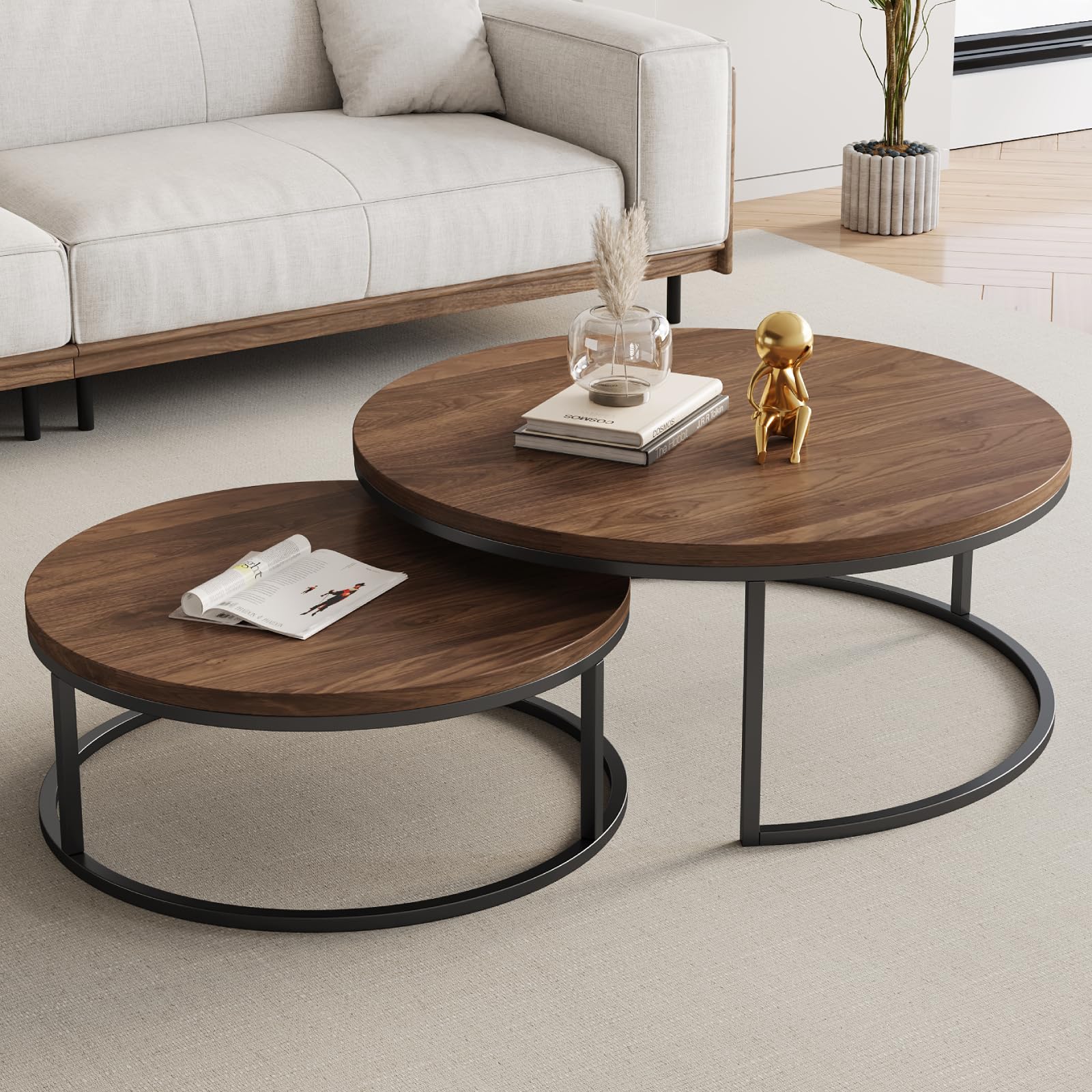 - This modern coffee table set features a sleek, minimalist style with two round coffee tables that can be stacked or used separately to fit your space. The nesting coffee table design allows for flexibility, perfect for various room layouts and modern décor.