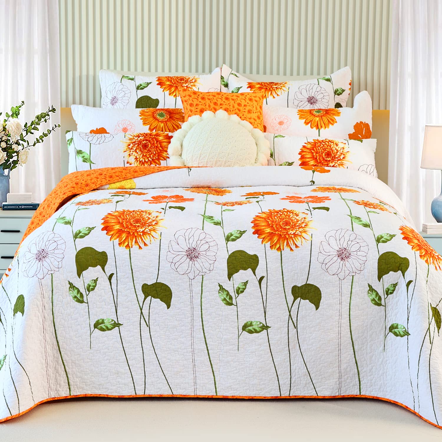 - The vivid orange sunflower and dahli on the bed cover in the crispy white shades contrast a distinctive look. By quilting the batting firmly with the shell to ensure the insert will not move and will be machine wash easily. While the bedspread back in same orange shade to coordinate with the flowers allows the coverlet be reversible beautifully.
