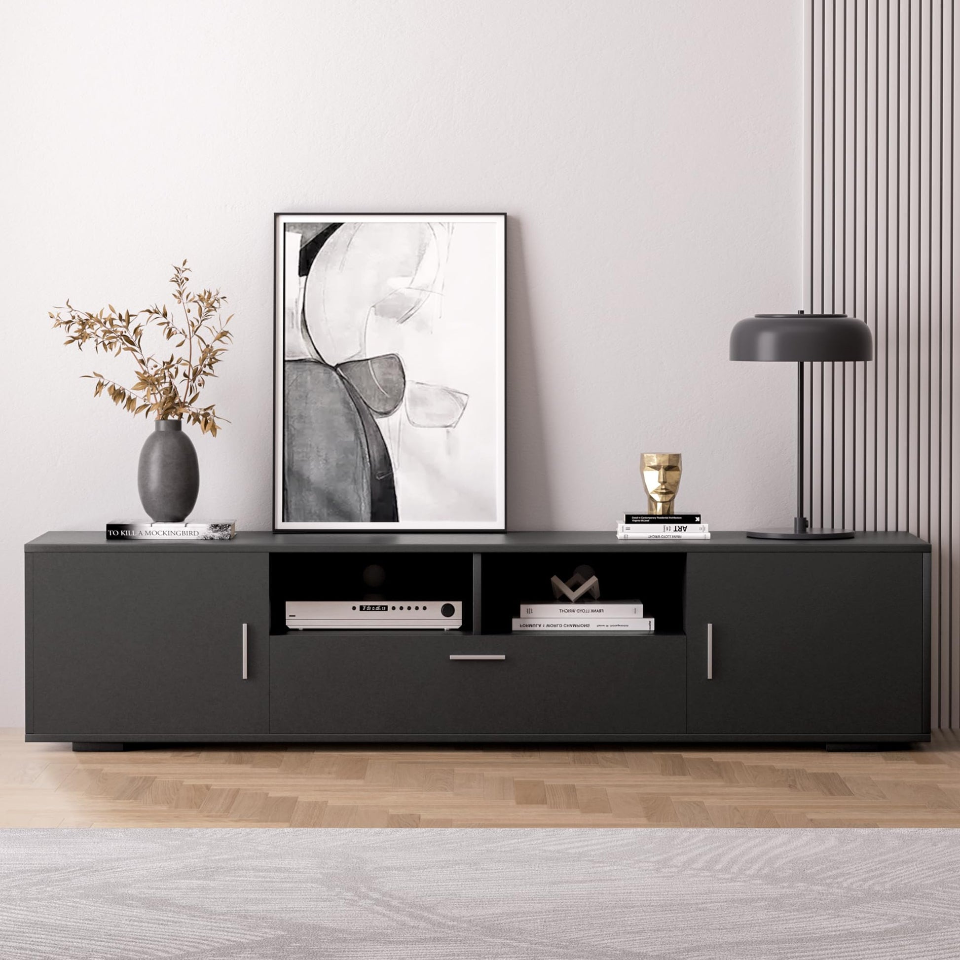 - LARGE STORAGE SPACE: The modern TV stand for 75 inch TV includes 2 side cabinets, 2 open storage shelves and 1 large drawer, providing ample open and private storage space to keep it neat and organized.