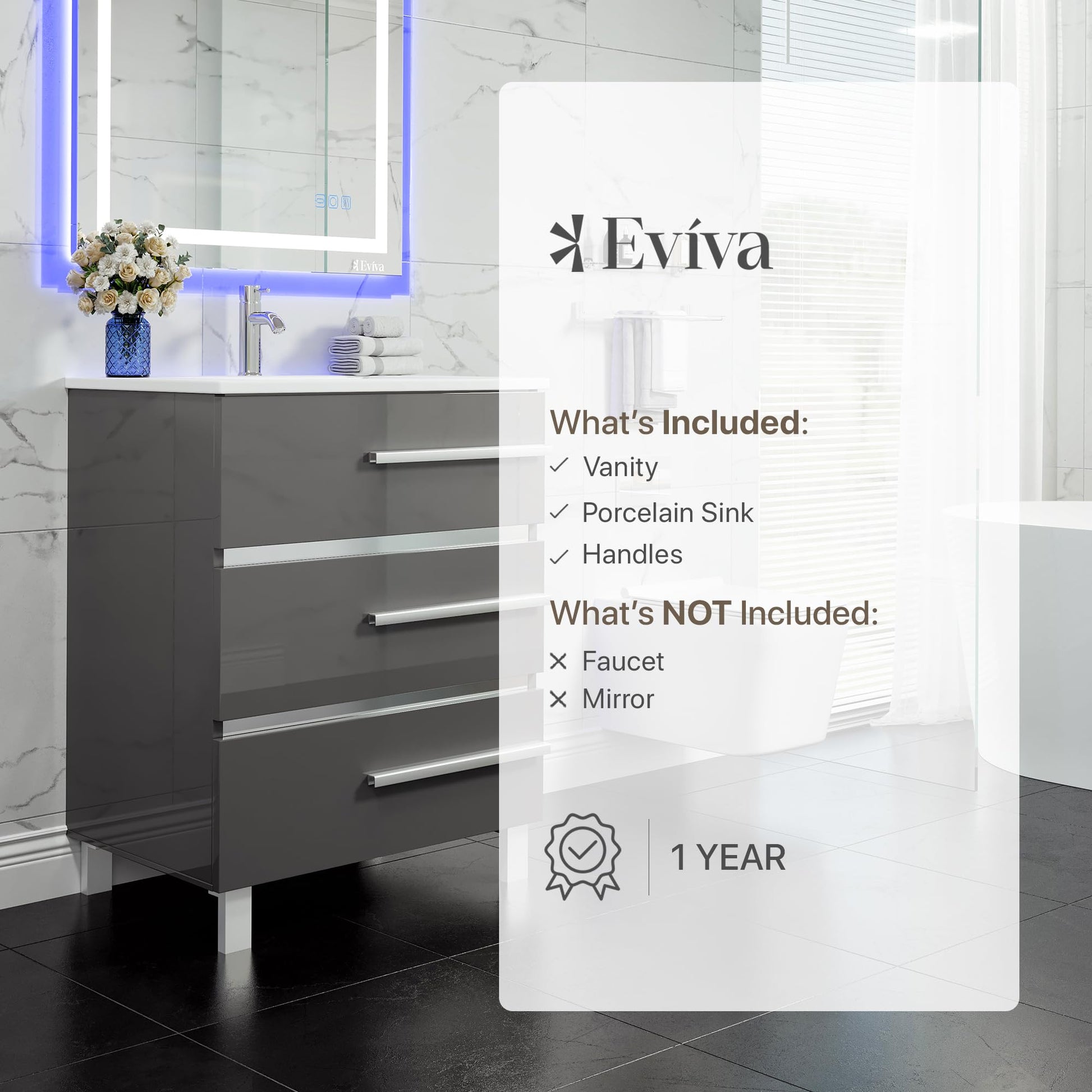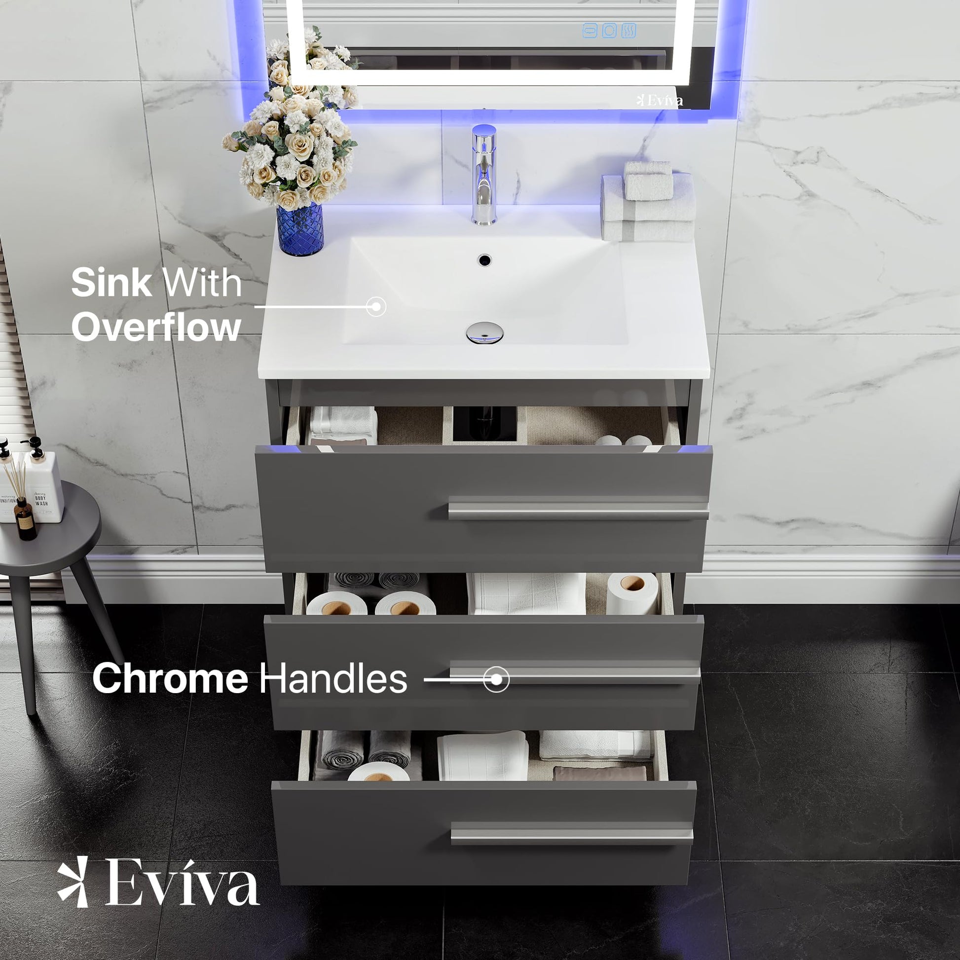 - Firm and Efficient — The Eviva Deluxe 32 inch vanity with sink is built for both durability and convenience. This bathroom sink vanity features a sleek Grey countertop and an integrated porcelain sink, ensuring a lasting and stylish addition to any bathroom. With three soft-closing drawers equipped with chrome hardware, this vanity provides effortless functionality, making it a practical and elegant choice for your home Decor.