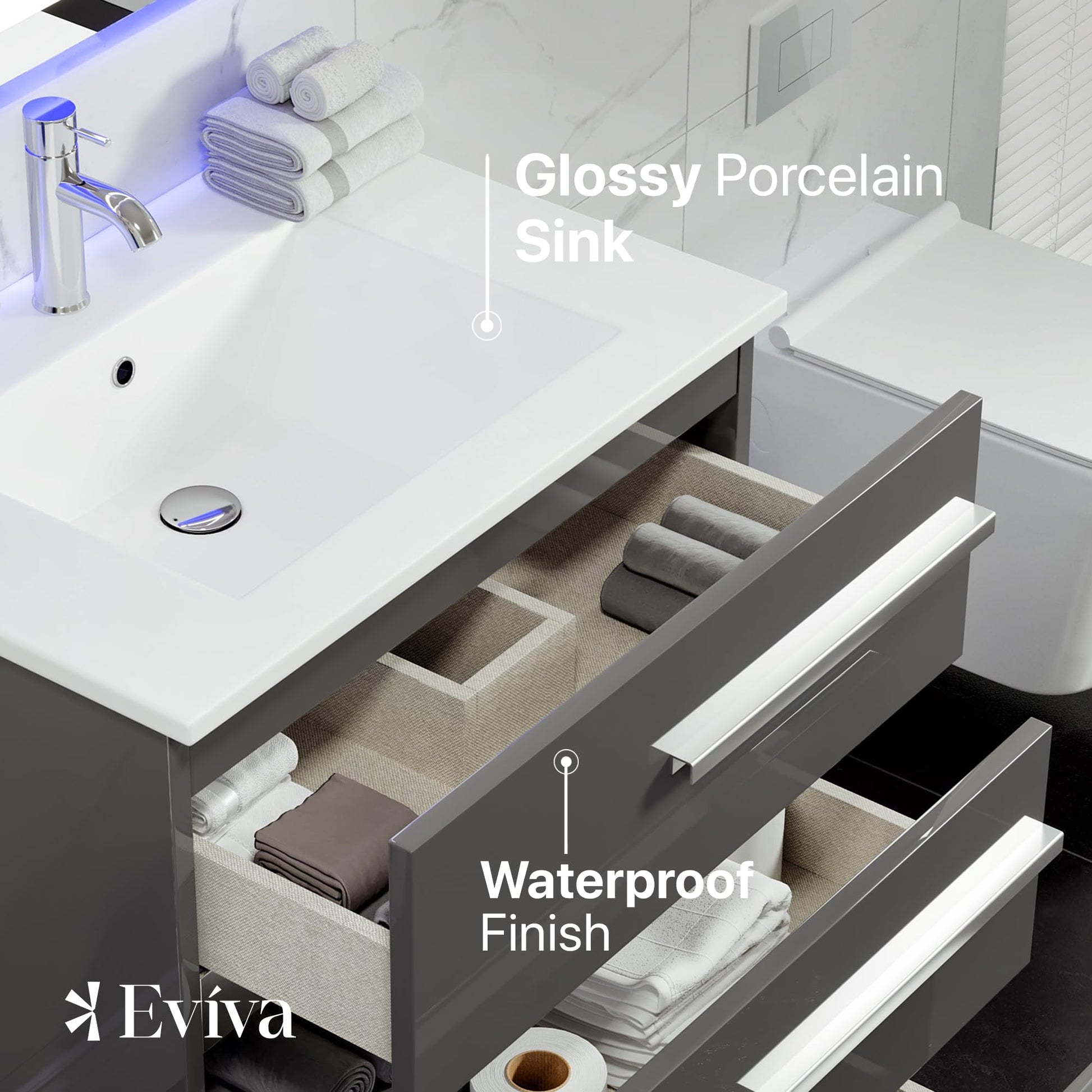 - Space-Saving Elegance — The Eviva Deluxe vanity sinks for bathrooms is the epitome of compact design and functionality. This 32 inch vanity with sink and countertop features a high-quality Grey integrated porcelain sink and a sleek countertop with a pre-drilled single hole faucet mount, offering a clean and contemporary look. Measuring 34"H x 32"W x 18"D. Equipped with three soft-closing drawers and elegant stainless steel legs, it provides ample space for your essentials.