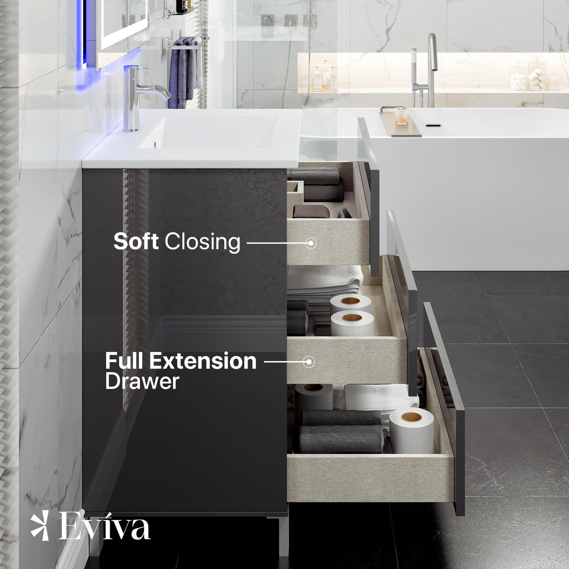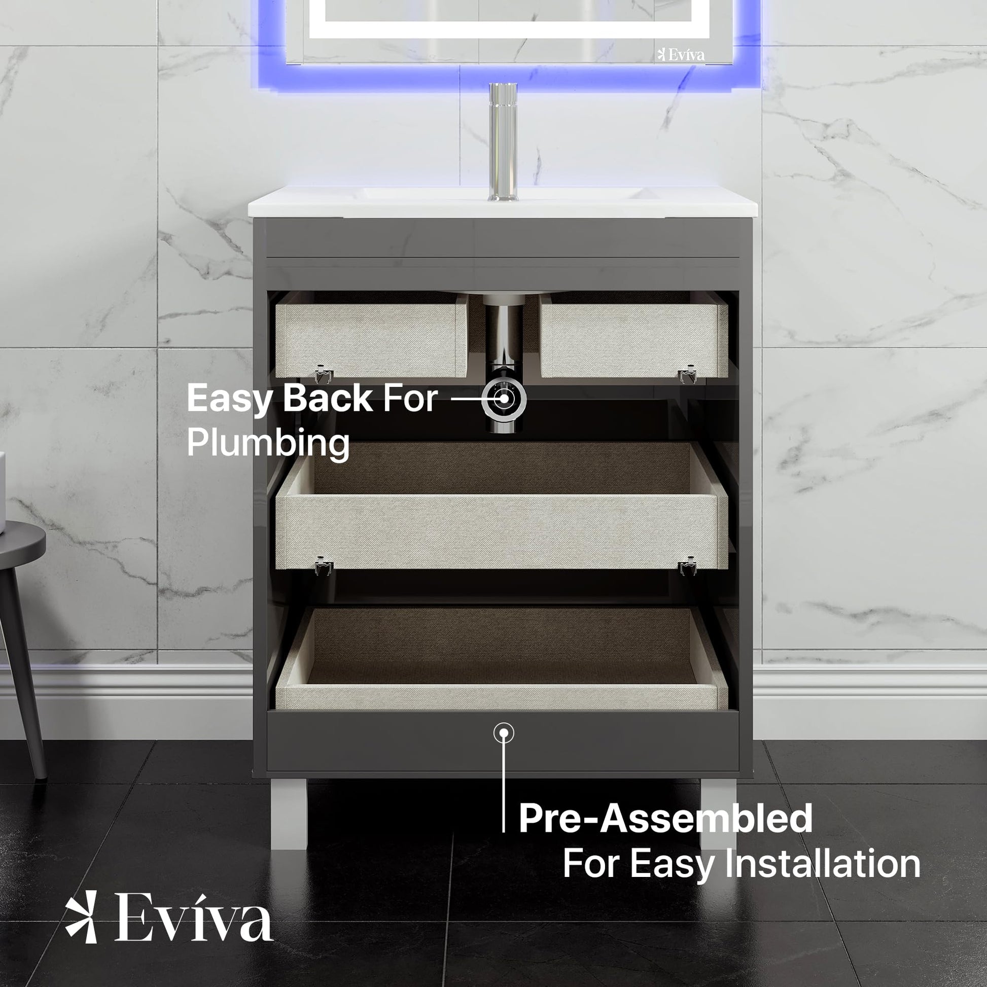 - Maximized Storage for a Clutter-Free Bathroom — Say goodbye to bathroom clutter with the Eviva Deluxe 32 bathroom vanity with sink. This bath vanity with sink features a spacious design with three soft-closing drawers, providing ample space to organize your cleaning products, toiletries, and bathroom essentials. The drawers, equipped with chrome hardware, offer a quiet and convenient storage solution that keeps your space neat and tidy