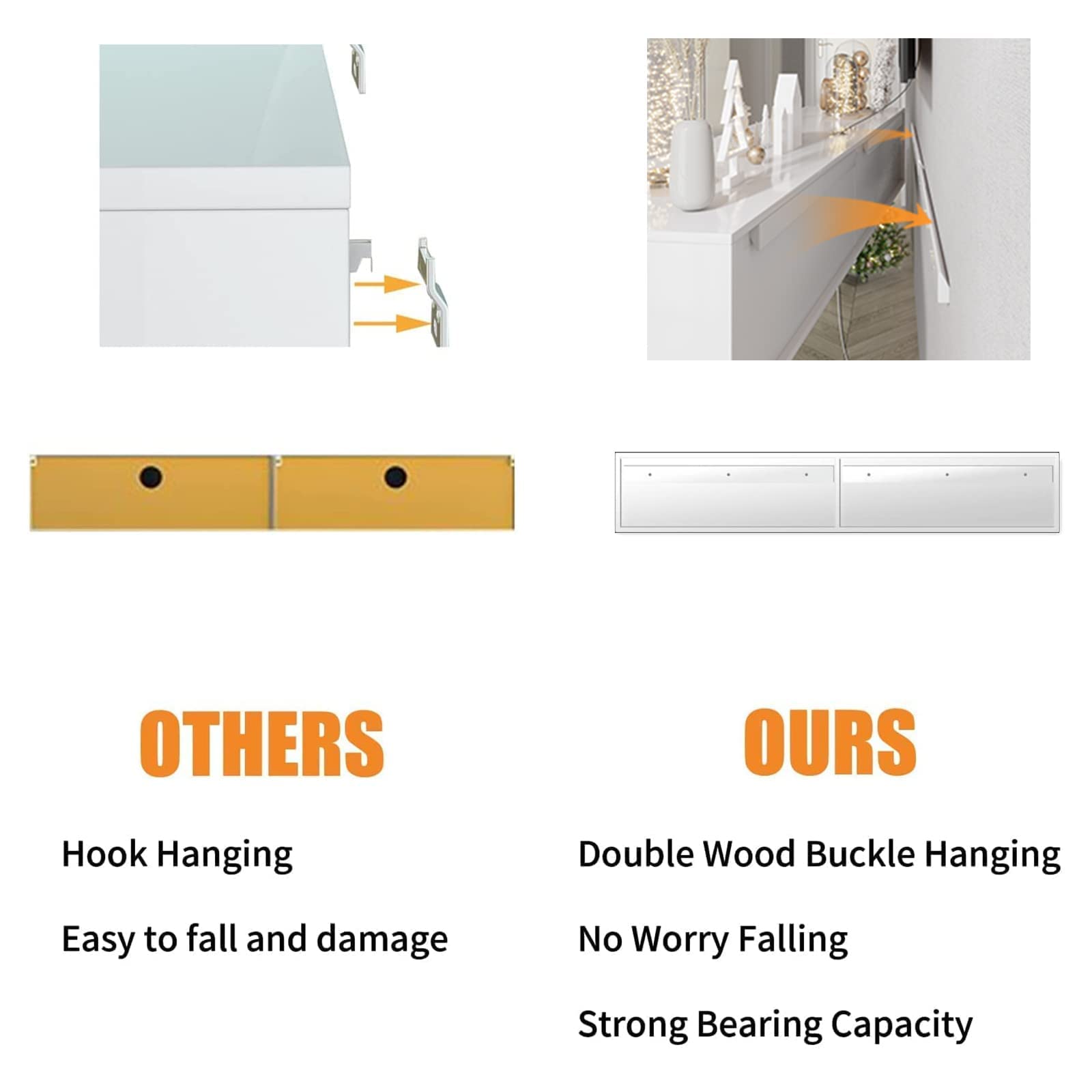 - This floating shelf is suitable for dry walls, wooden walls, plastered walls and solid walls (not suitable for hollow walls and plasterboard walls). The floating TV cabinet comes with all hardware parts and step-by-step manual, easy to assemble in short time. Any question please feel free to contact us and your issue will be resolved within 12 hours.