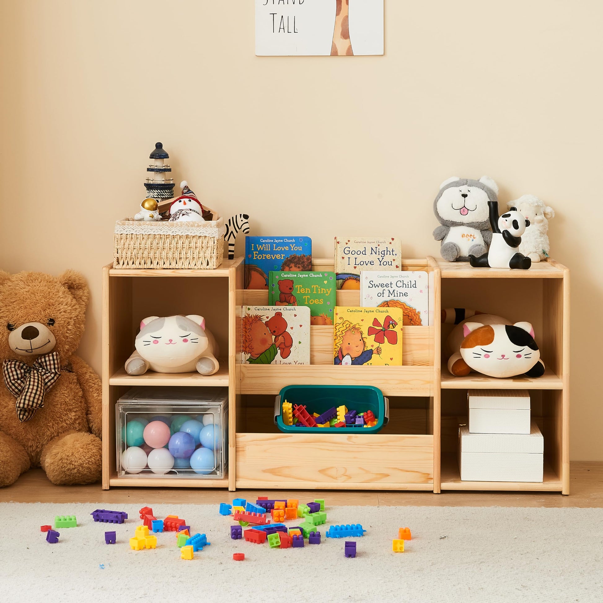 - Safety comes first! This storage unit features rounded edges for worry-free play. The perfect height lets little ones easily reach toys and books, fostering independence. Crafted from durable pinewood, it's built to last through years of playtime.