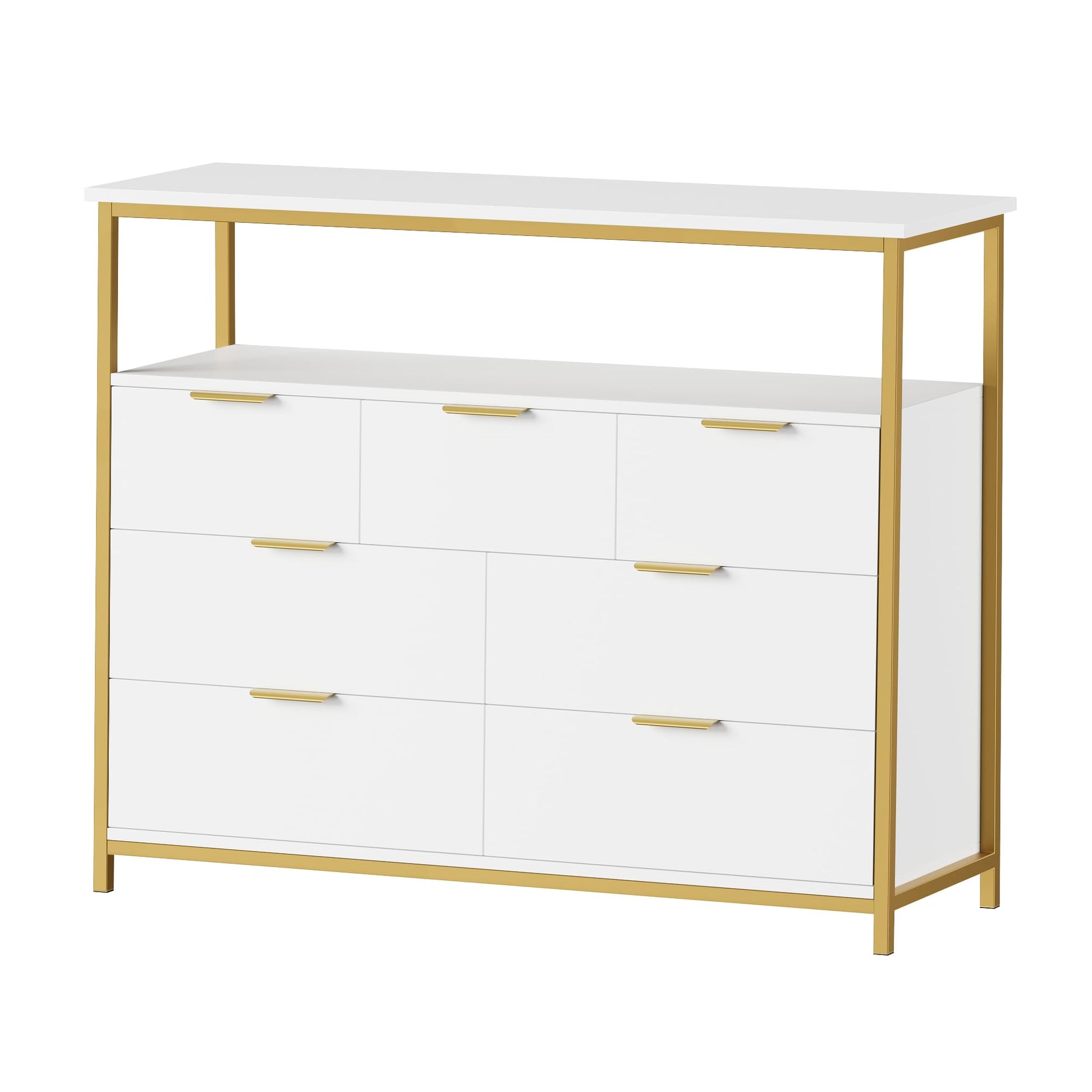 - This 7-drawer dresser with its sleek white finish, sleek lines, and gold frame makes it a perfect blend of modern and classic, ensuring it stands out without being overbearing.