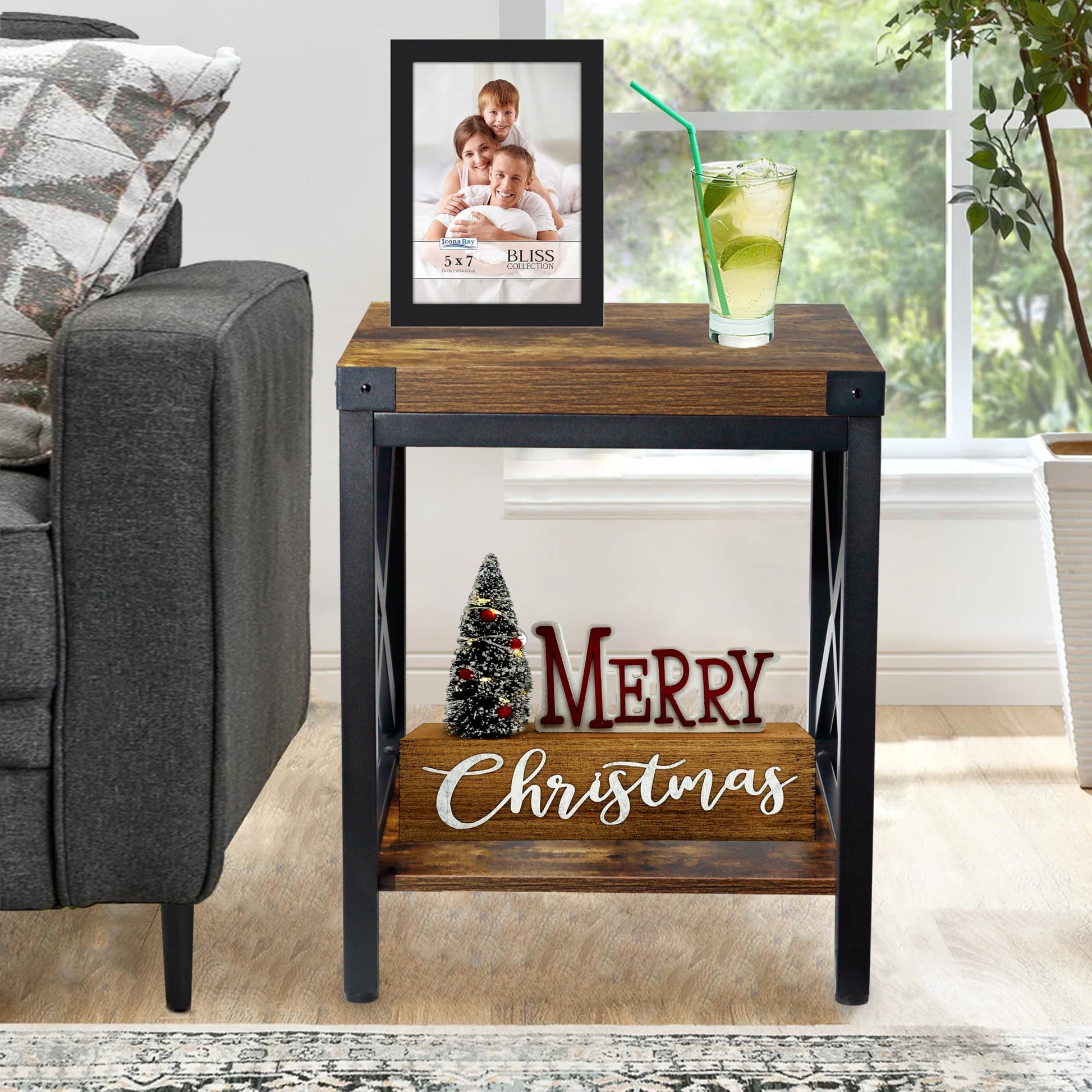 - Add a rustic touch to your living space with this industrial side table. You'll be amazed at how this charming table can transform your space with its simple addition.