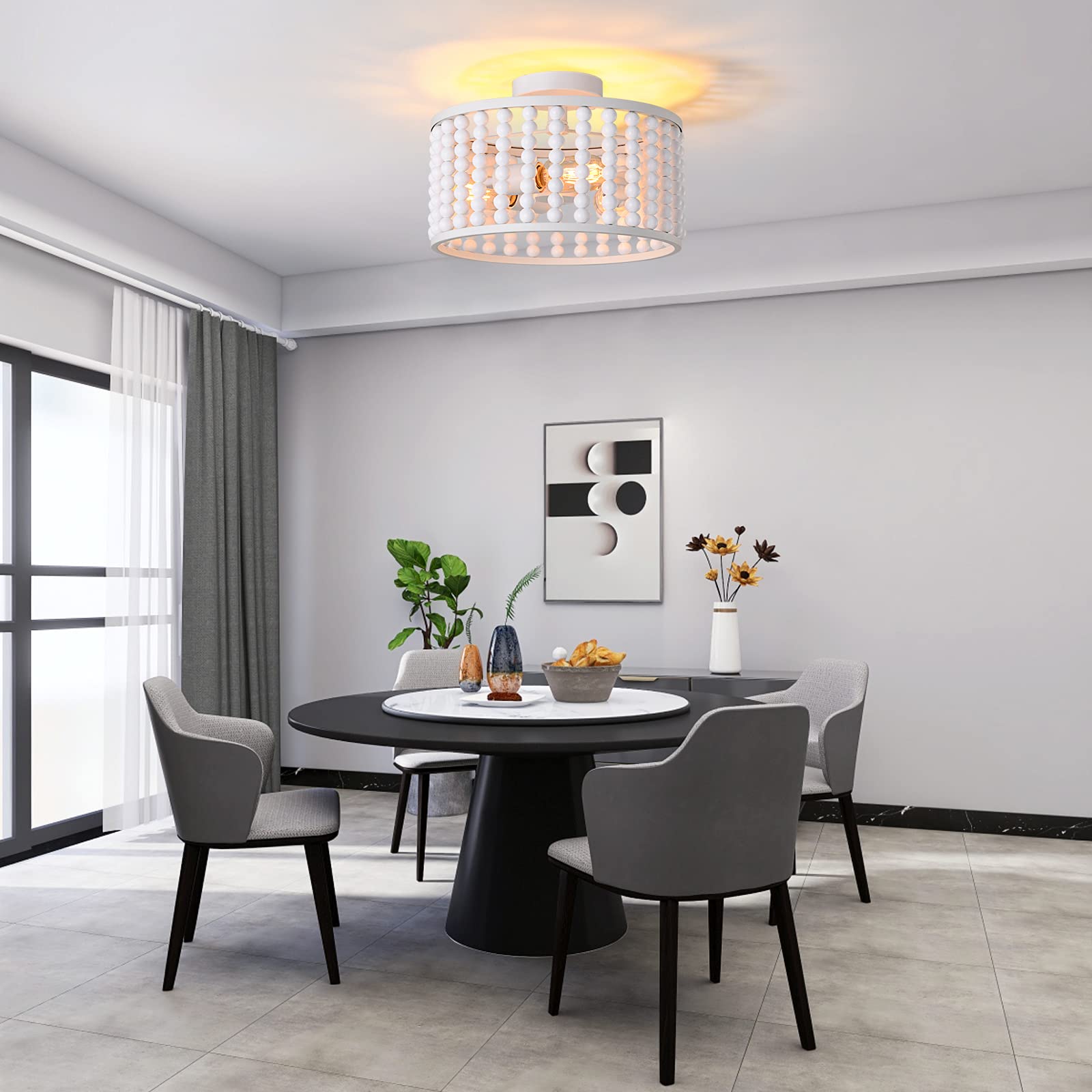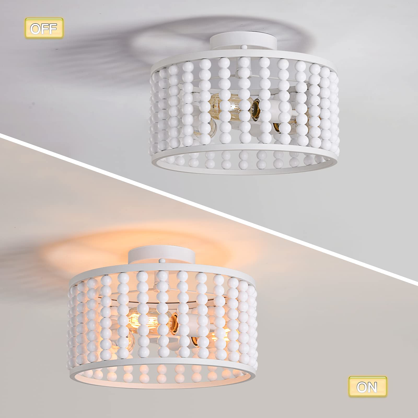 Boho Light Fixture, 3-Light Wood Beaded Chandelier, White Semi-Flush Mount Ceiling