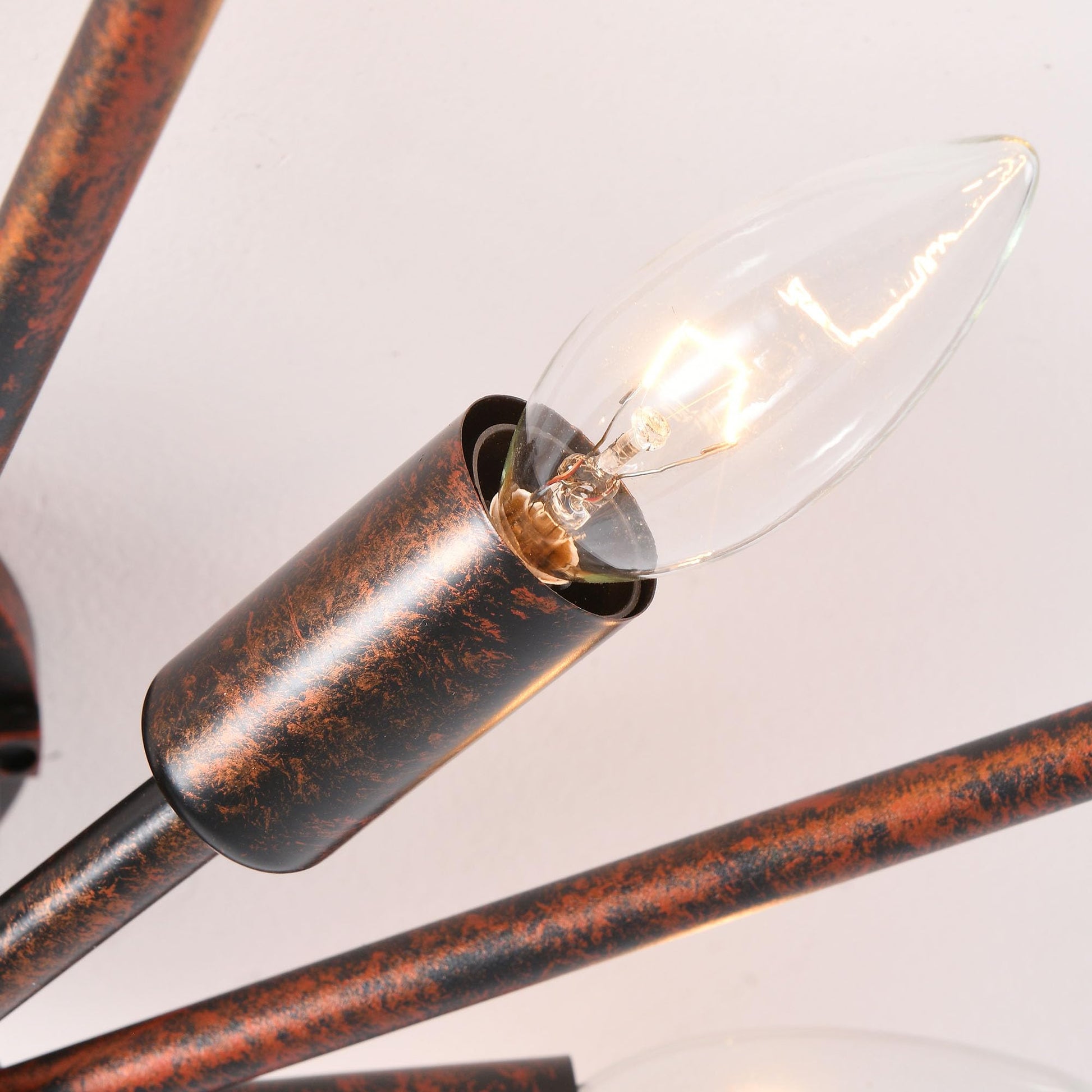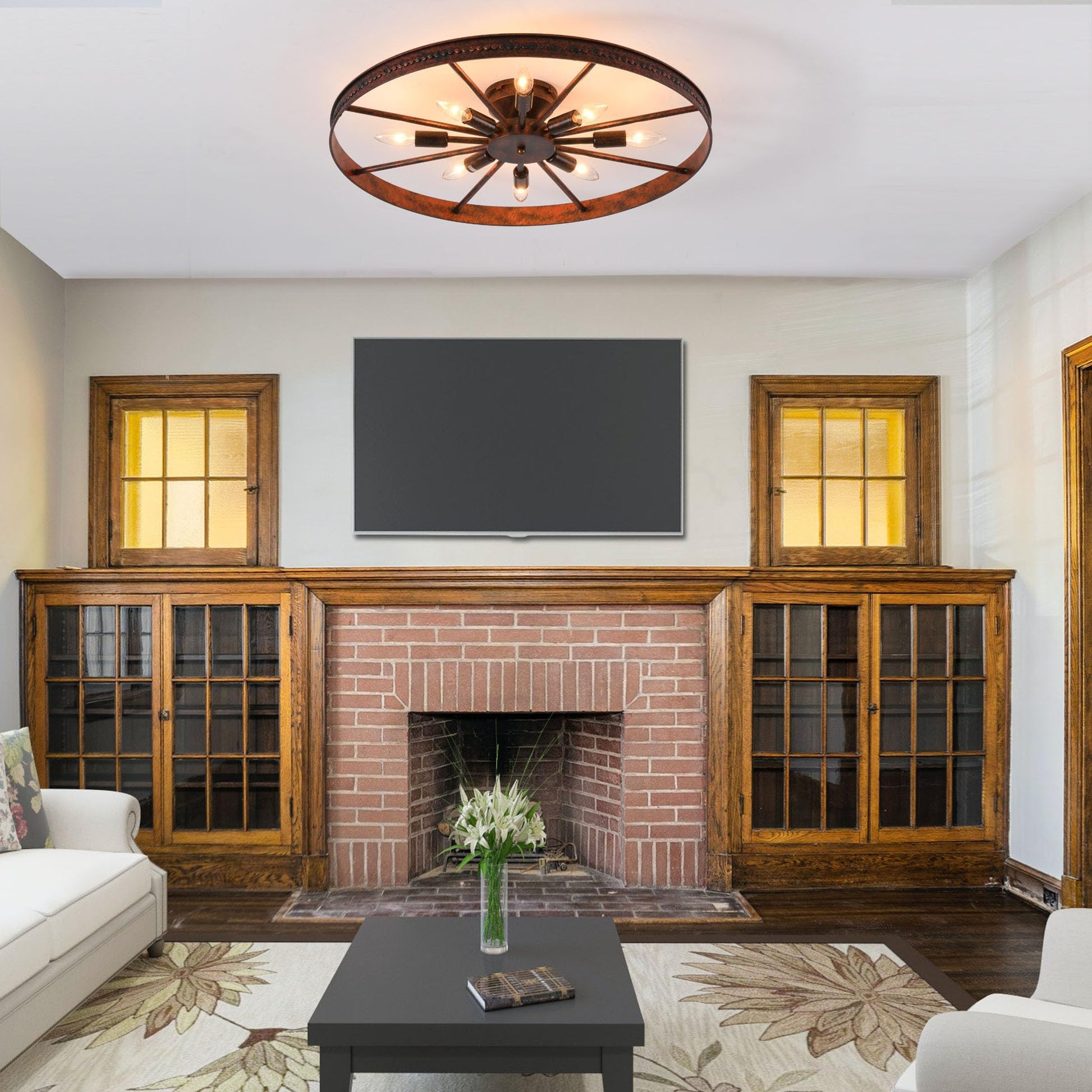 The eight-light configuration provides ample, evenly distributed lighting while the E12 candelabra base sockets offer versatility in bulb selection. The close-to-ceiling design maximizes headroom while delivering a bold visual statement that complements farmhouse, industrial, and transitional décor styles.