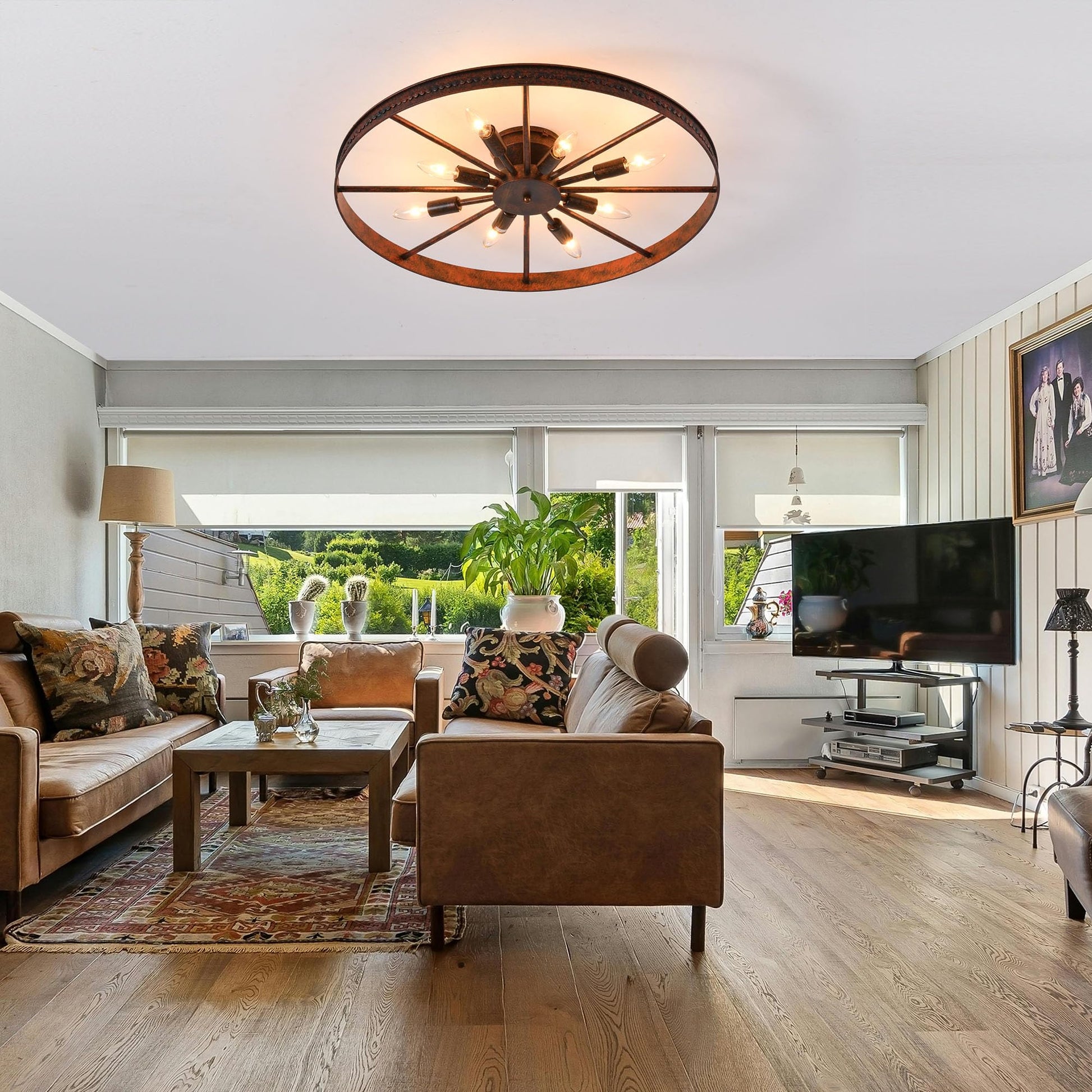 Transform your space with this stunning farmhouse-style ceiling light fixture, featuring a distinctive red rust metal finish that adds warmth and character to any room. This 26.8-inch flush mount fixture combines rustic charm with functional illumination, making it an ideal choice for dining rooms, living rooms, kitchens, and entryways.