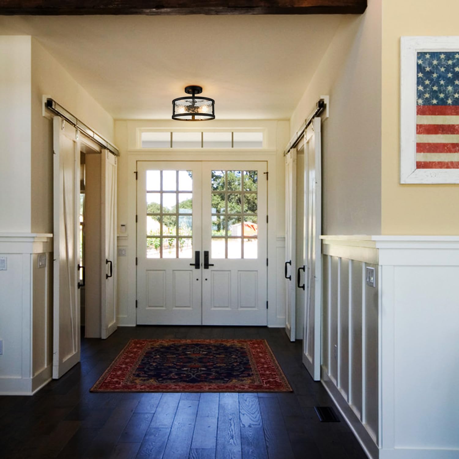 Farmhouse Semi Flush Mount Ceiling Light - 2-Light Black Fixture with Hammered Glass