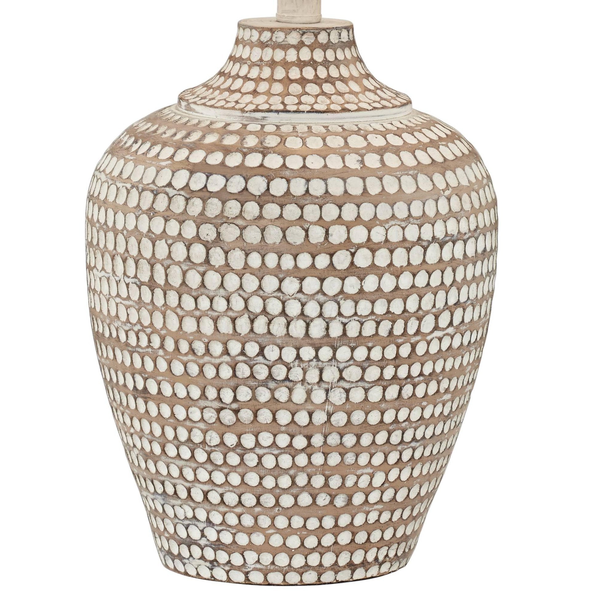 Design Features: The jug-shaped silhouette showcases a light earth tone matte finish with an artisanal faux hammered texture, accented by a charming clay white polka dot pattern. The unbleached oatmeal linen shades provide warm, diffused lighting while complementing the rustic aesthetic.