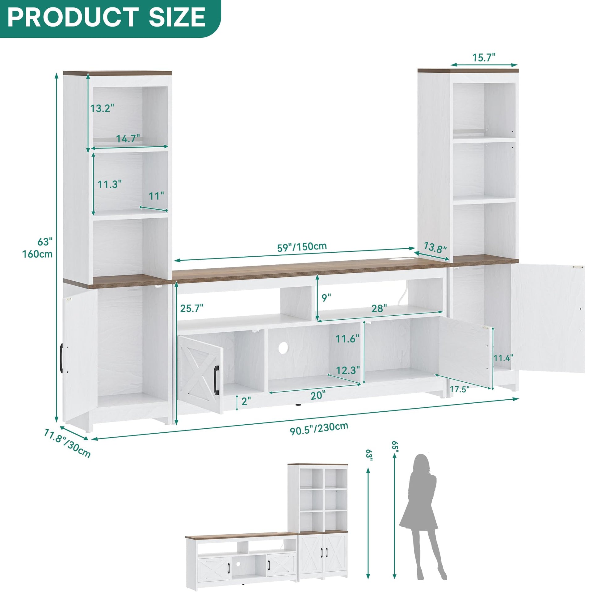 - Multiple bookshelves and storage compartments for media equipment, books, and décor