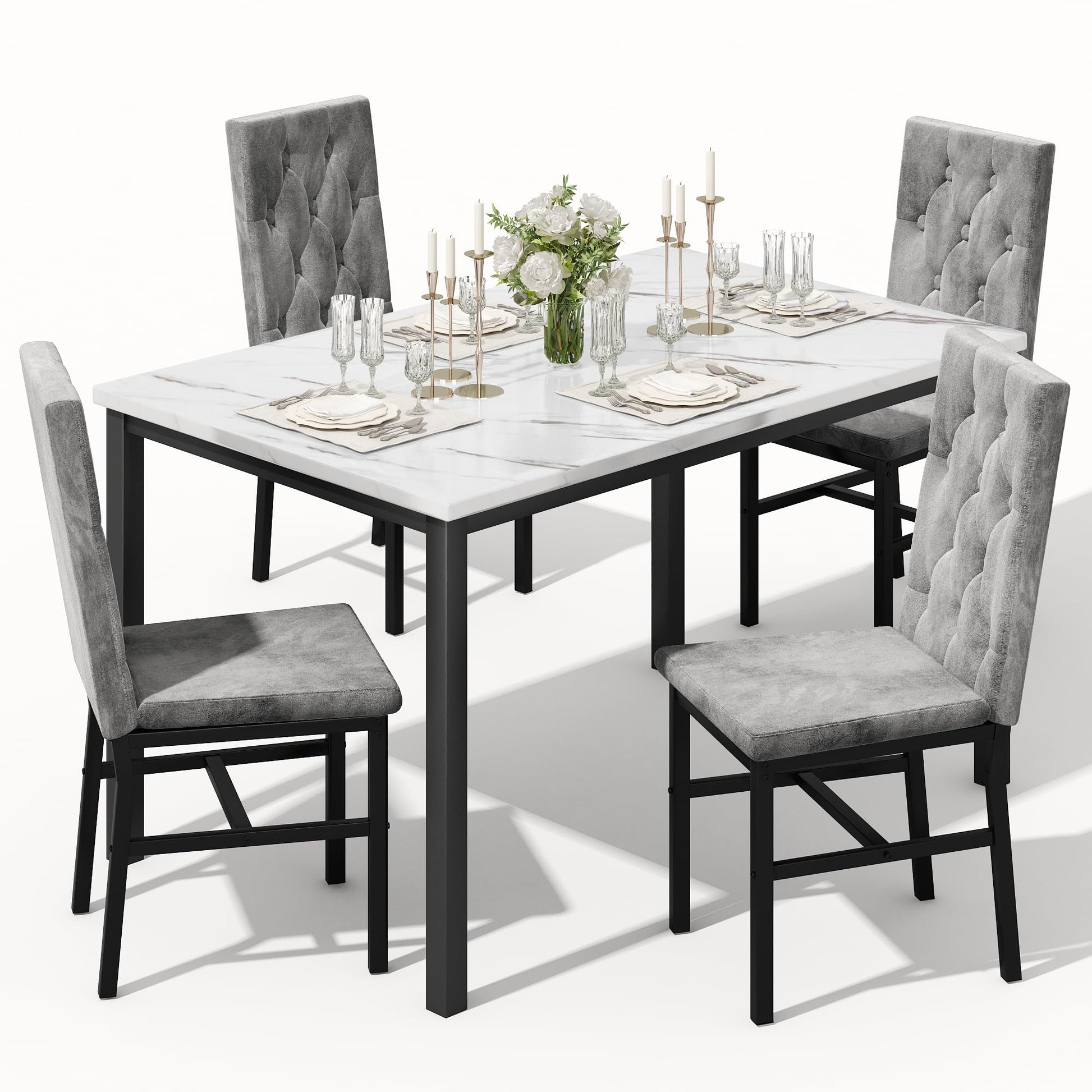 Elevate your dining space with this elegant 5-piece dining set featuring a stunning faux marble tabletop and four luxuriously button-tufted chairs. Designed for contemporary homes, this set combines premium aesthetics with practical functionality, making it the perfect centerpiece for intimate dinners and memorable gatherings.