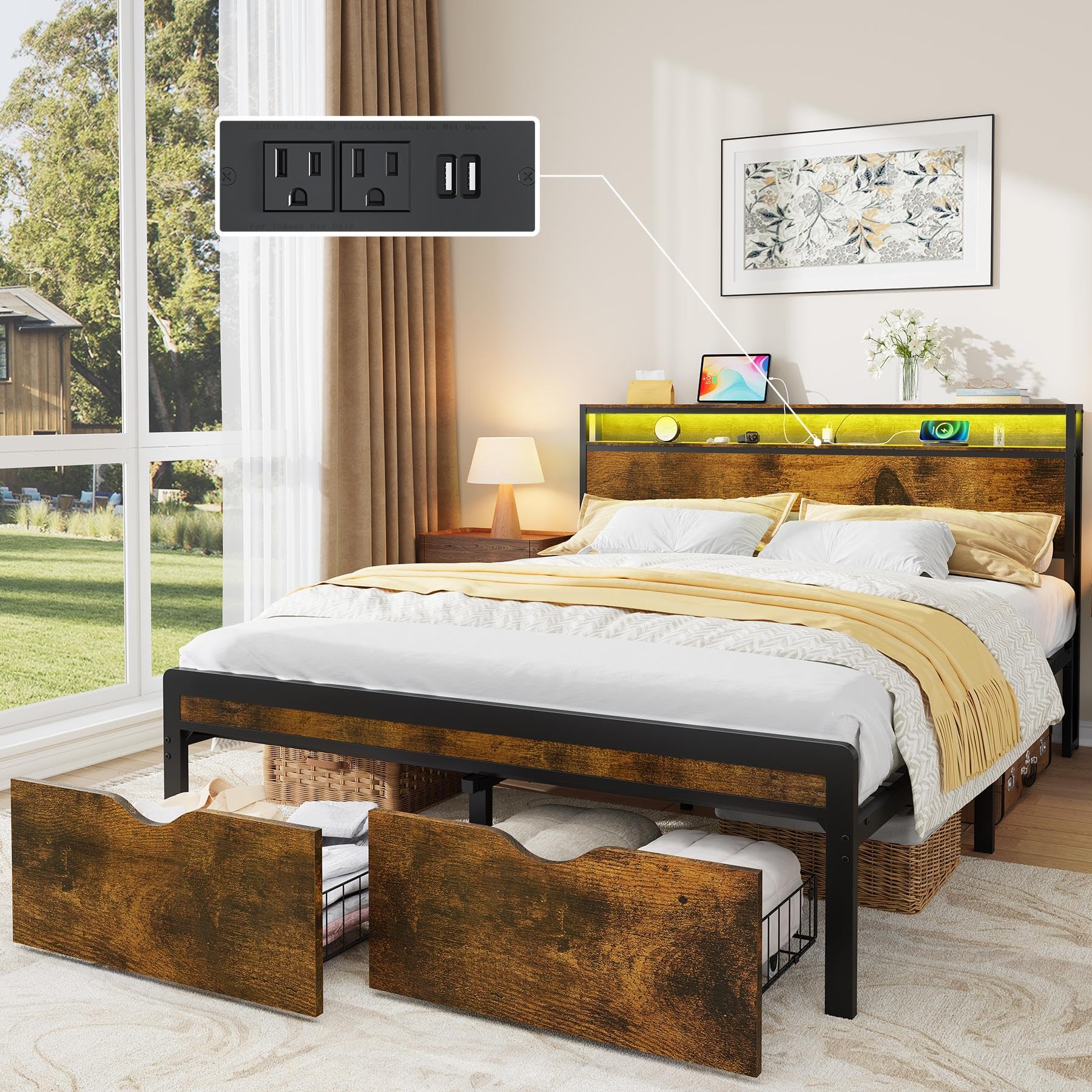 - Features a headboard with a built-in charging station, this bed frame with storage designed with 2 AC outlets & 2 USB port with 5ft long power cord, allowing you to charge a variety of electronic devices within easy reach. The 2-tier storage shelf on the headboard provides more storage space for magazines, cell phones, alarm clocks and other frequently used items. Improved backboard design prevents dropping of small items