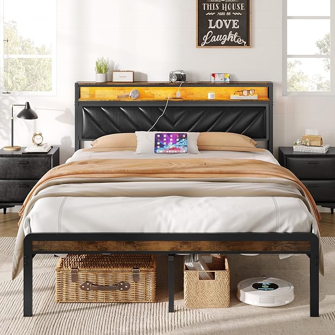 - This full size bed frame is equipped with RGB LED light strips, which can be set to LED color, brightness, mode, etc. through the remote control provided, meeting the needs of different styles and scenes. Vintage wooden headboard with adjustable led lighting adds chic style to your room and makes your home life more colorful