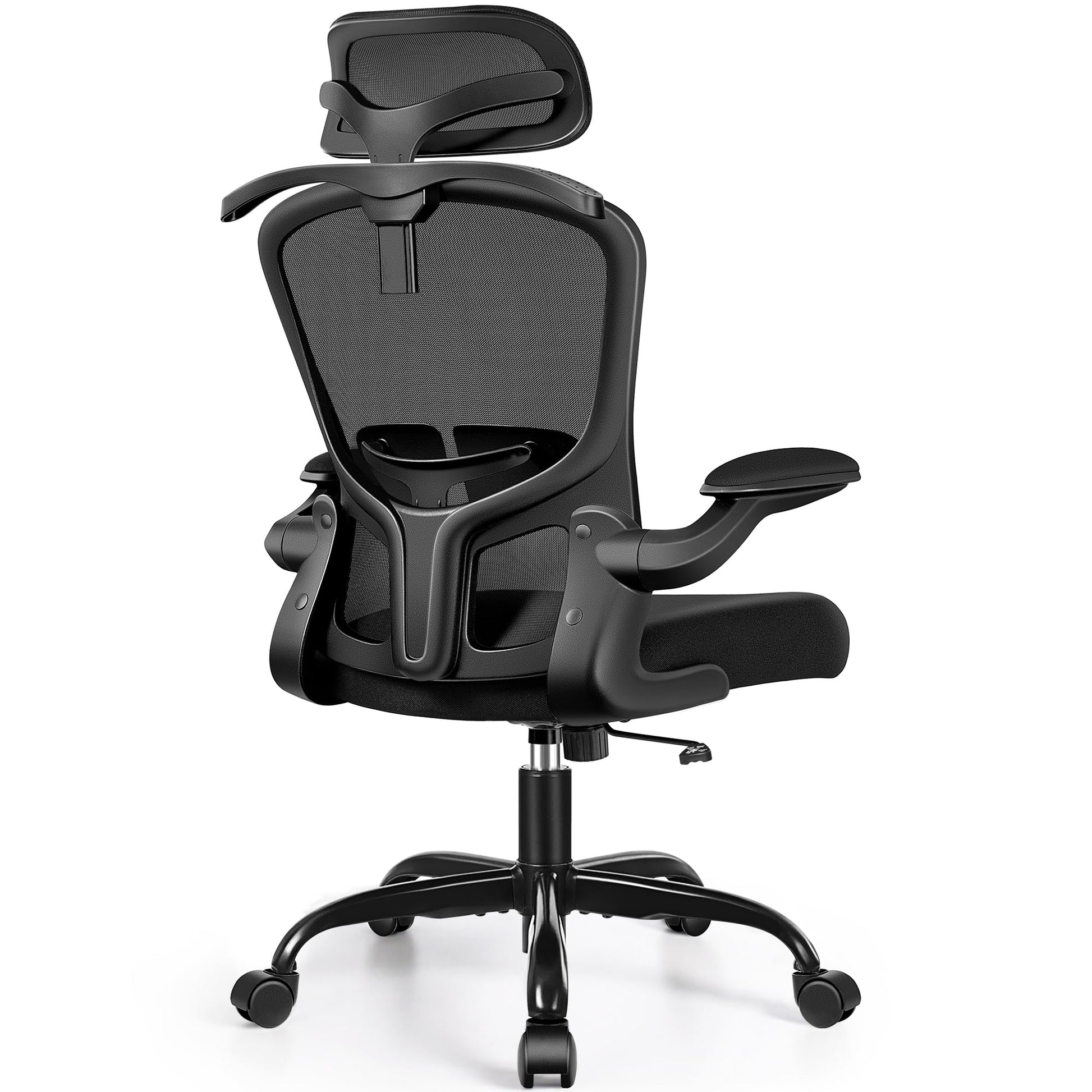 - Adjustable Desk Chair with Wheels:Ergonomic office chairs allow for easy height adjustments and 360° rotation, offering mobility and convenience. Flip-up armrests enable you to effortlessly slide the chair under the desk, saving valuable space. An adjustable wide, curved mesh headrest caters to various body types, giving additional comfort by effectively supporting the head and neck.