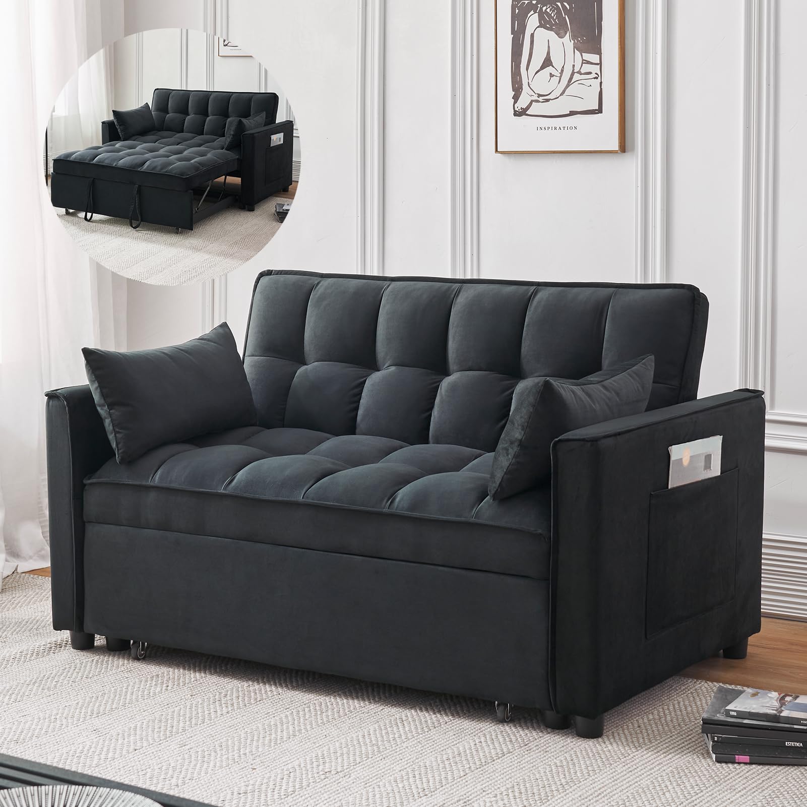 - High-Quality Fabric&Clever Design:Our sofa bed is meticulously crafted with high-quality velvet fabric, ensuring a luxurious feel without the worry of pilling or wrinkles. Additionally, a unique storage pocket on the side allows you to keep essentials like remote controls, keys, books, or even your phone within reach, leaving a lasting impression on every customer.