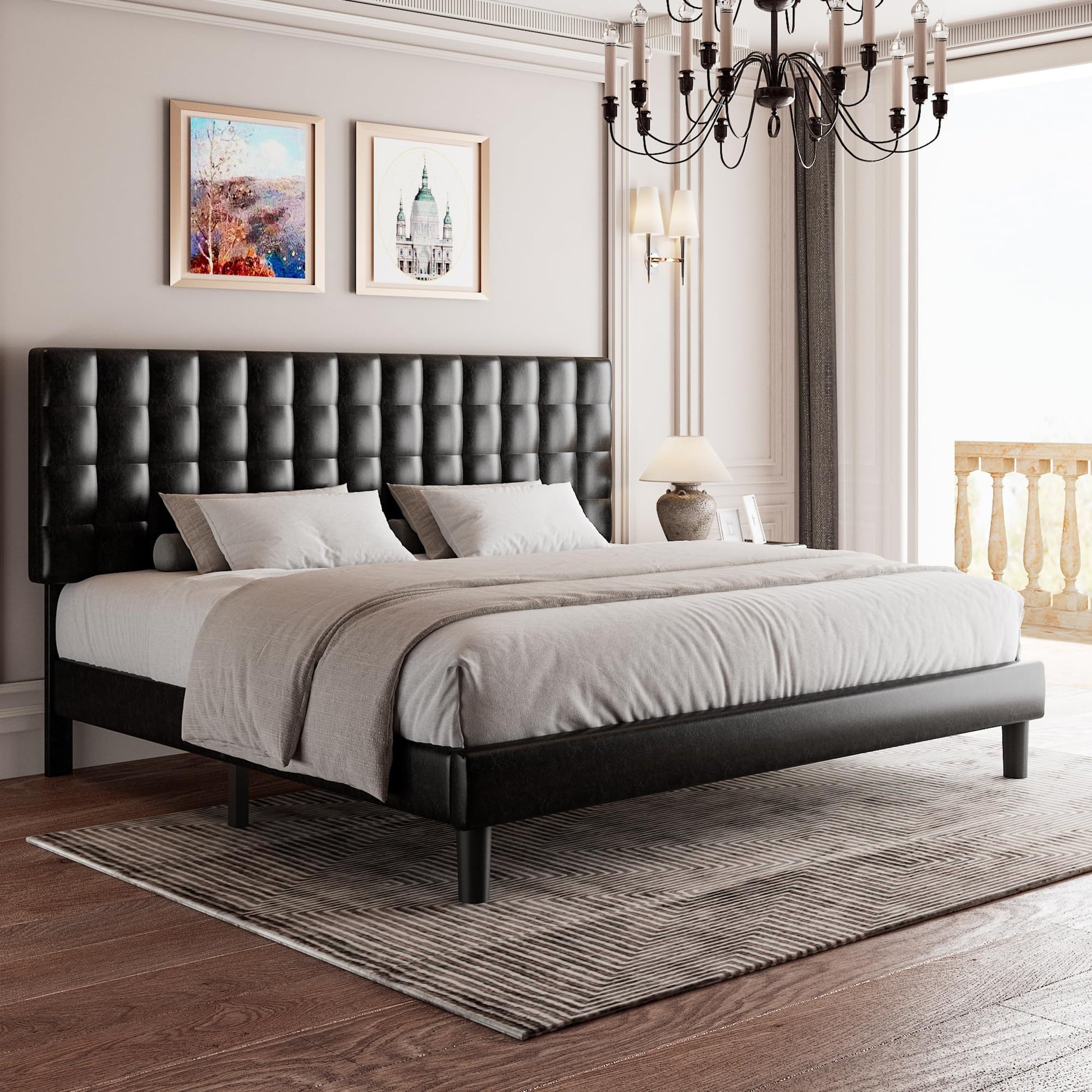 King Size Bed Frame with Square Stitched Headboard, Faux Leather