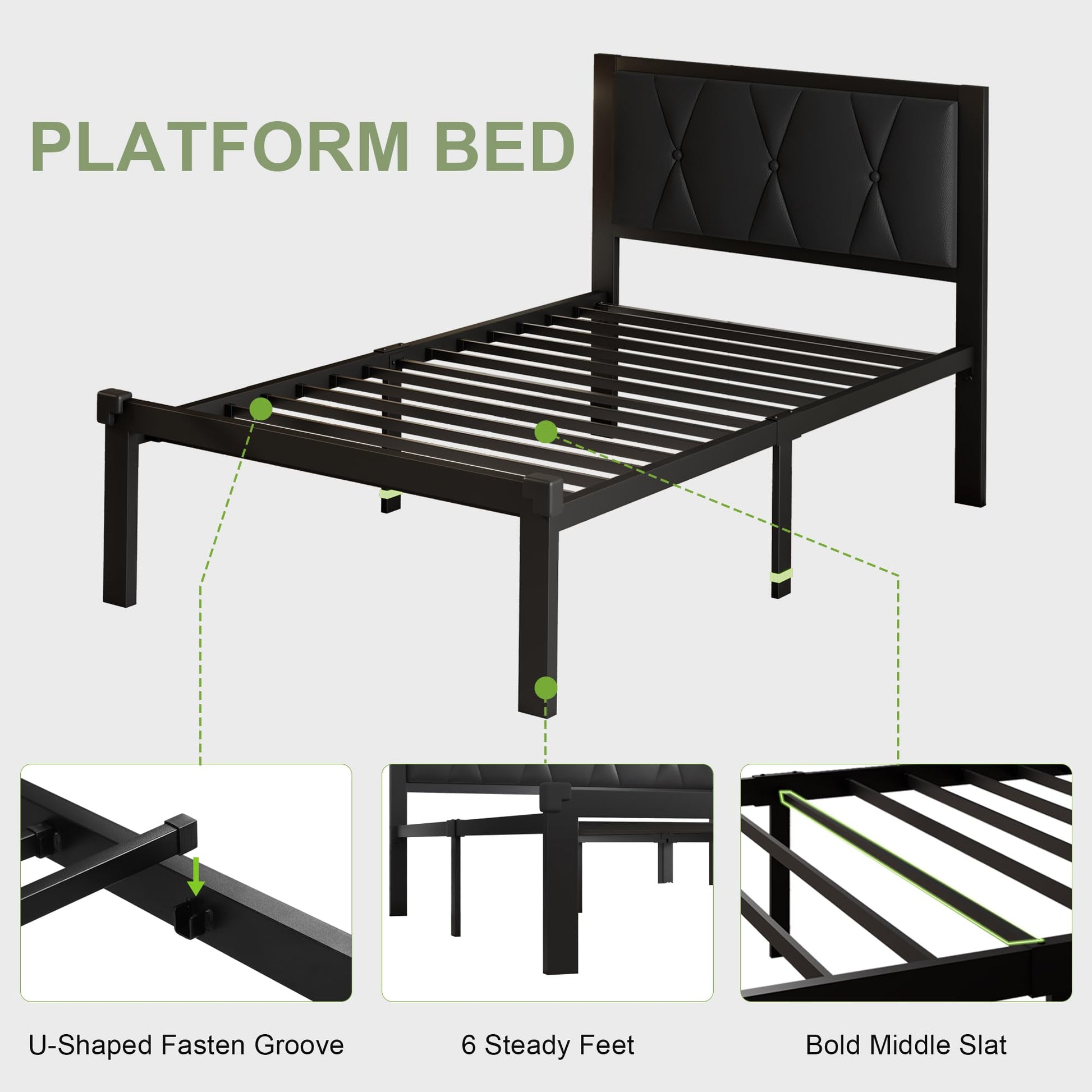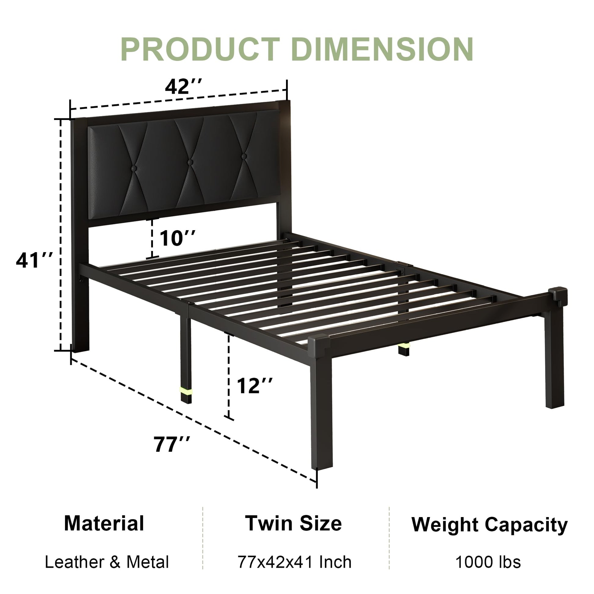 Twin Size Metal Bed Frame with Faux Leather Button Tufted Headboard,