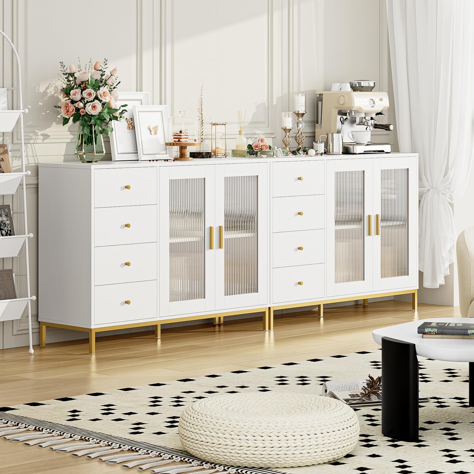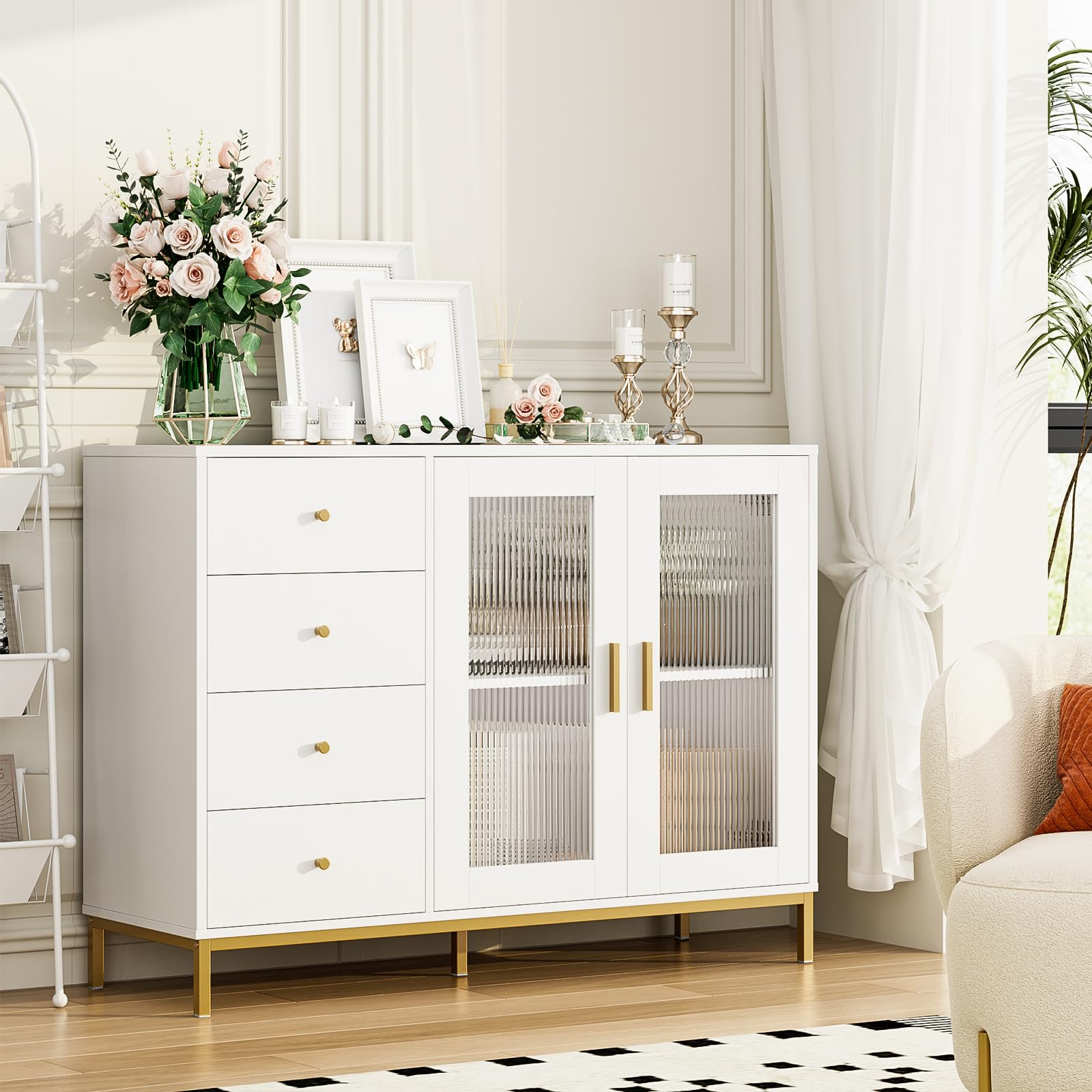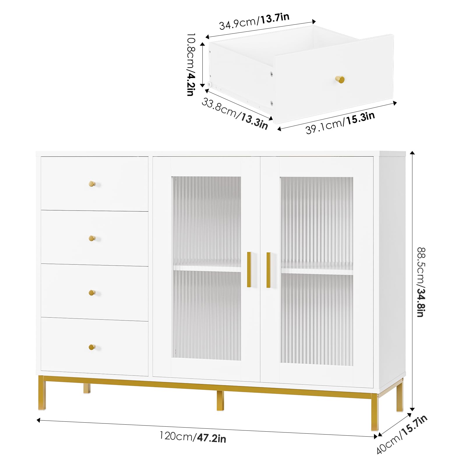 - Design Your Dream Space Crafted from premium particleboard, textured glass, and lustrous gold handle, this white sideboard isn't just furnitureit's a lifestyle statement. Its white and gold color scheme not only brightens your room but also adds a touch of luxury that elevates any decor.