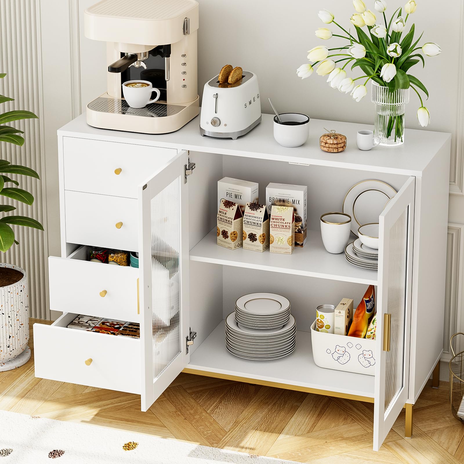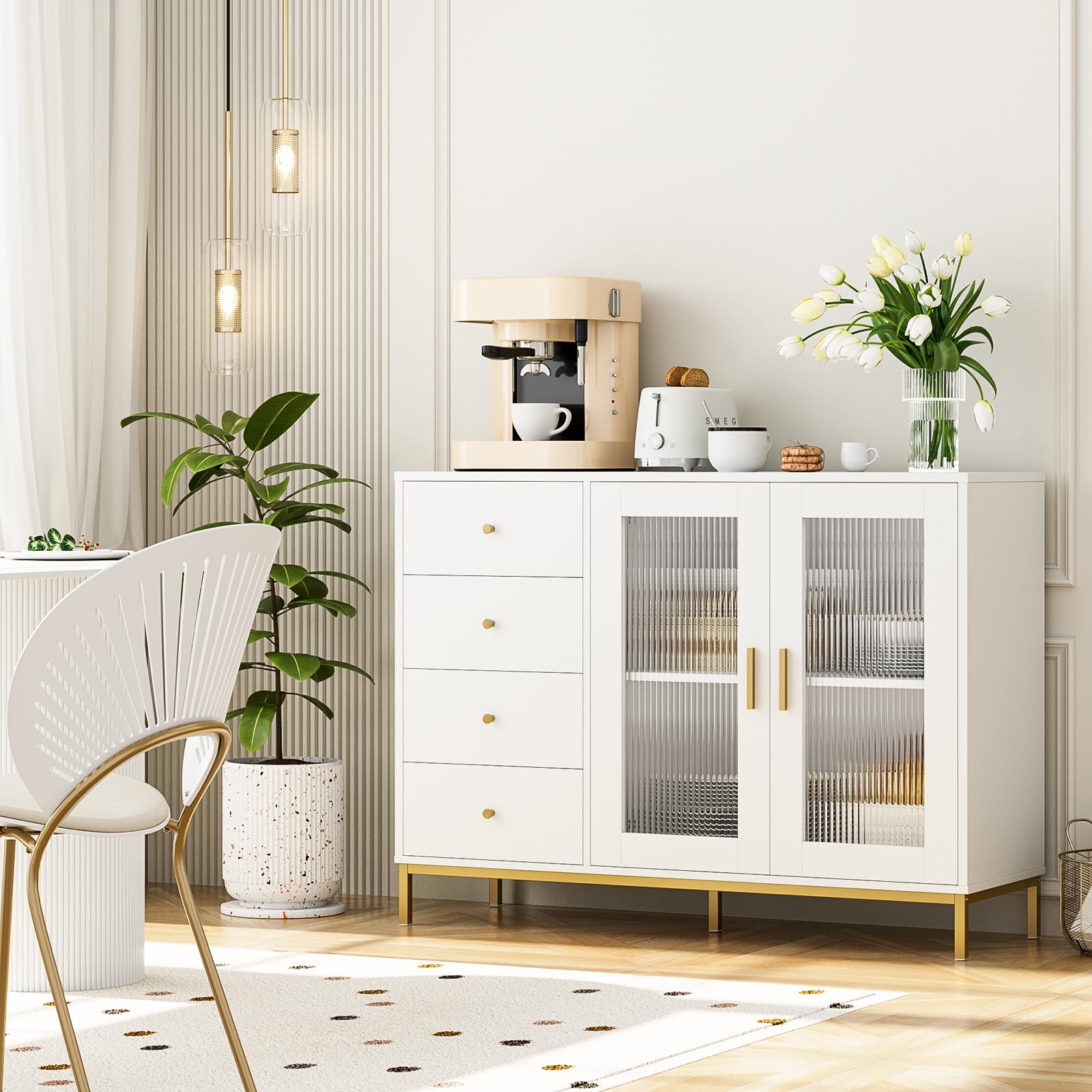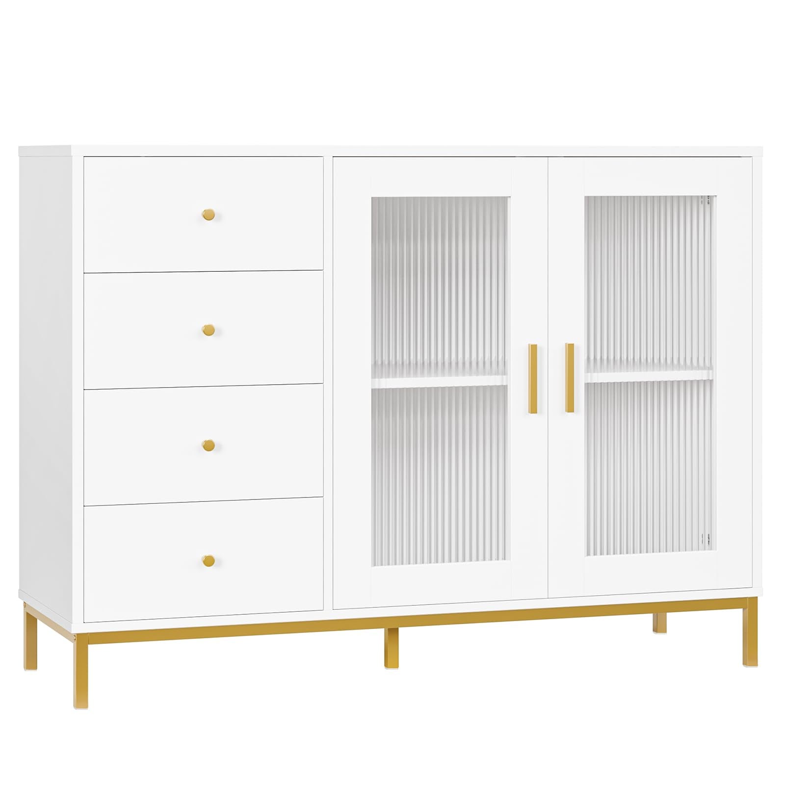 finetones Sideboard Buffet Cabinet with Storage, 47.2" White Gold Kitchen Cabinet with Fluted Glass Doors and Gold Metal Legs,