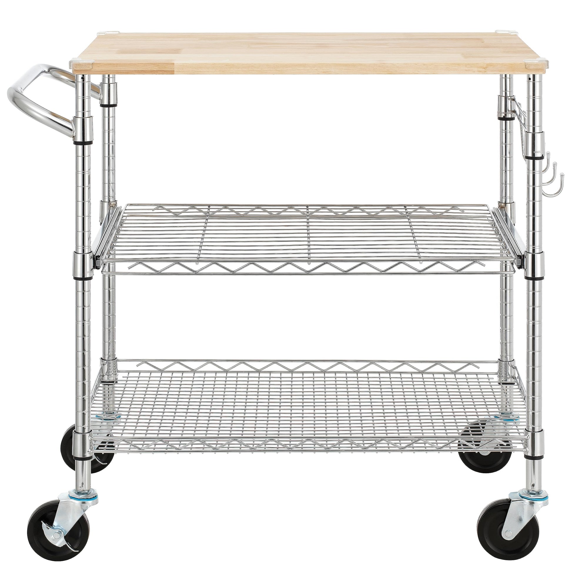 - This kitchen utility cart is constructed from industrial-strength steel, the bottom shelf is made of 69 pieces of thicken wires to make sure the shelf will not deformation when loaded heavy weight, the max loading capability of bottom shelf is 500 lbs, and the middle slider is 100lbs. 20mm thickness oak top to make sure it can hold 200lbs on top. The whole cart equipped with 1 inch diameter poles. The commercial grade material ensure the quality and long service life.