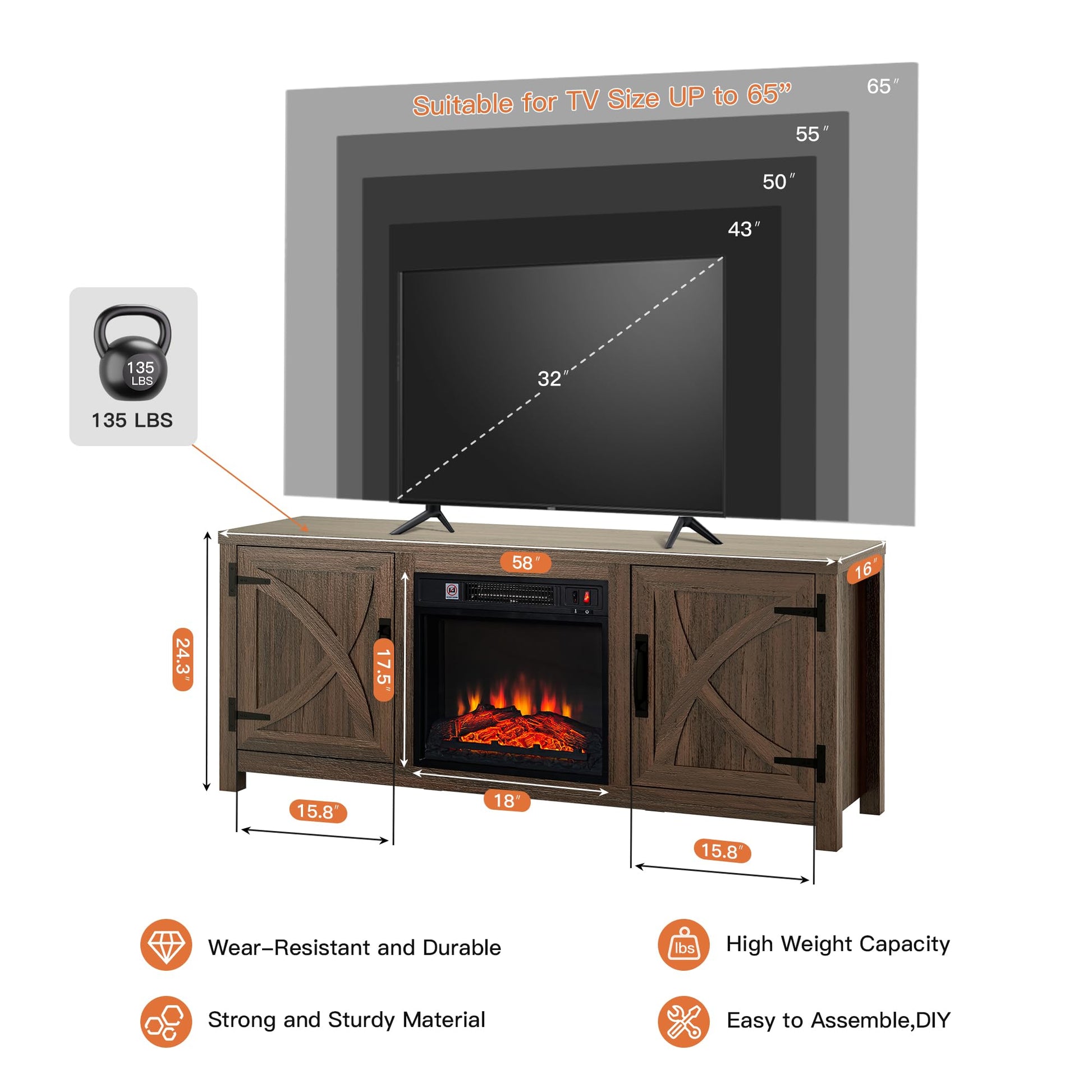 - Large TV Compatibility The fireplace tv stand can warm up spaces up to 400 square feet and cabinet is measures 58"L x 16"W x 24.3"H, fits TVs up to 65 inches and supports up to 135 pounds, suitable for living room, bedroom.