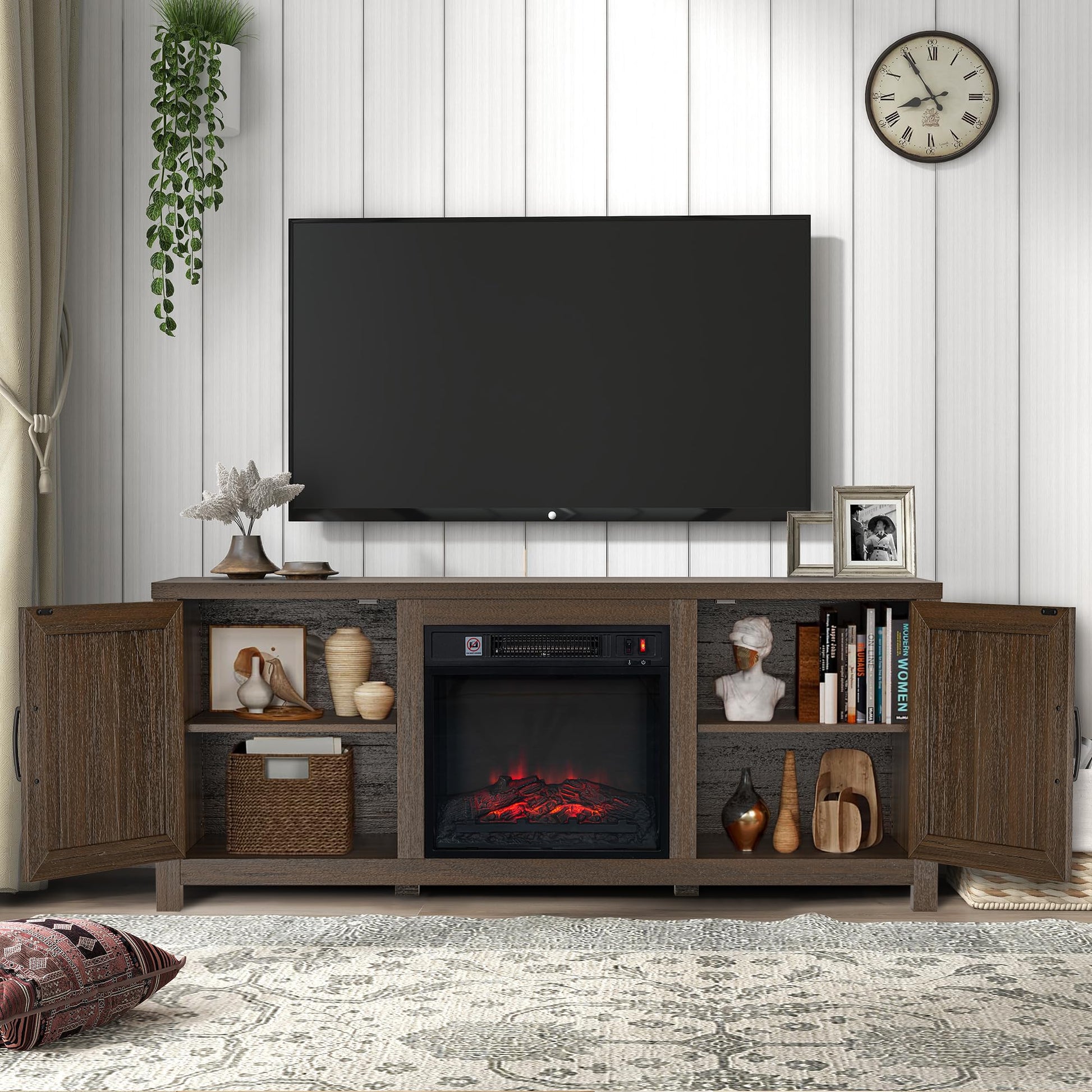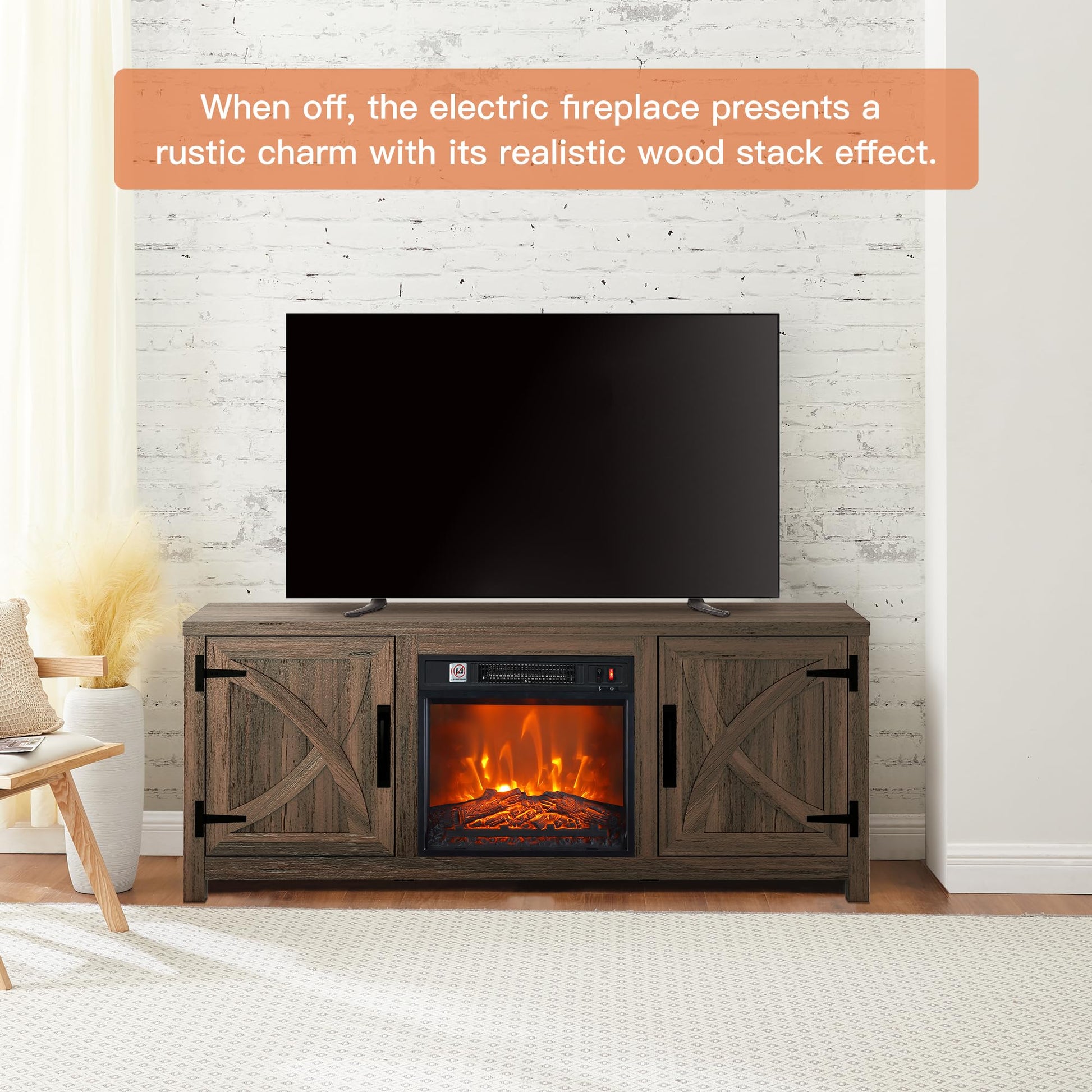 - Durable Construction The tv with fireplace is made from high-quality MDF and laminate.Enhance your living room with a traditional modern style media console featuring uniquely designed cabinet doors reminiscent of barn doors.Comes with detailed instructions for quick and hassle-free setup.