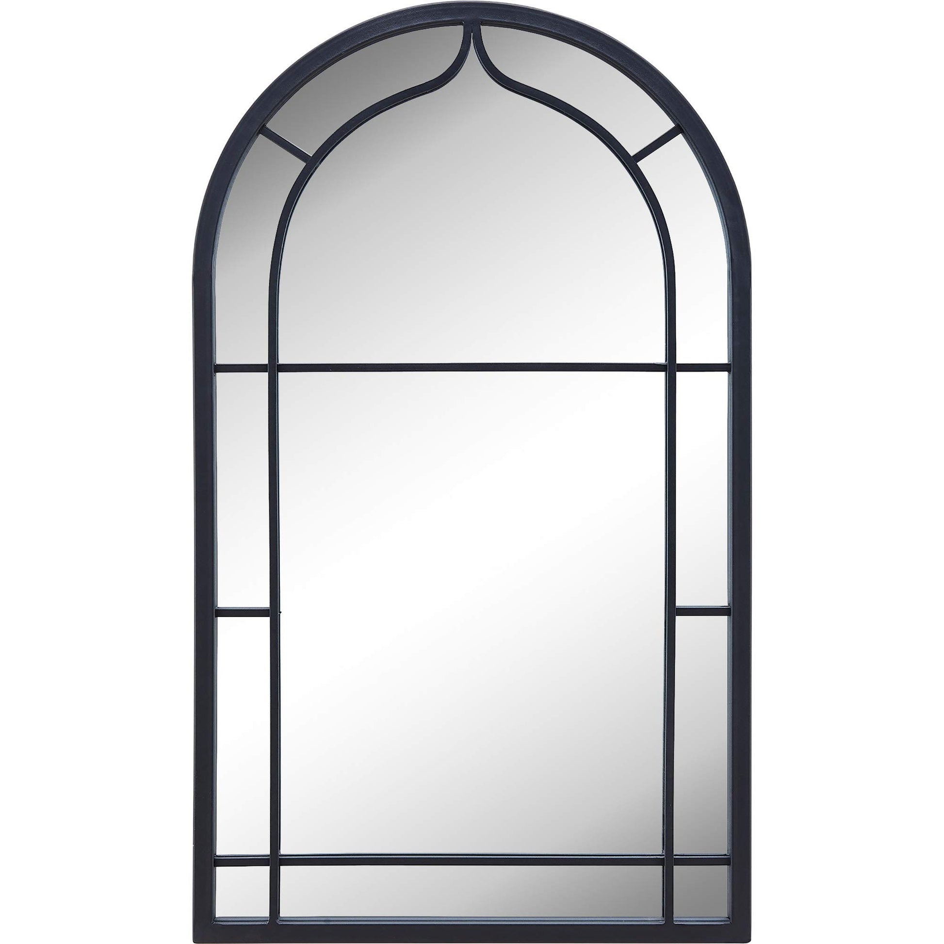 - IT’S IN THE DETAILS – This arched mirror is crafted of glass surrounded by a dark gray metal frame, complete with an aged finished and arched ironwork detailing to give it the perfect farmhouse appeal.