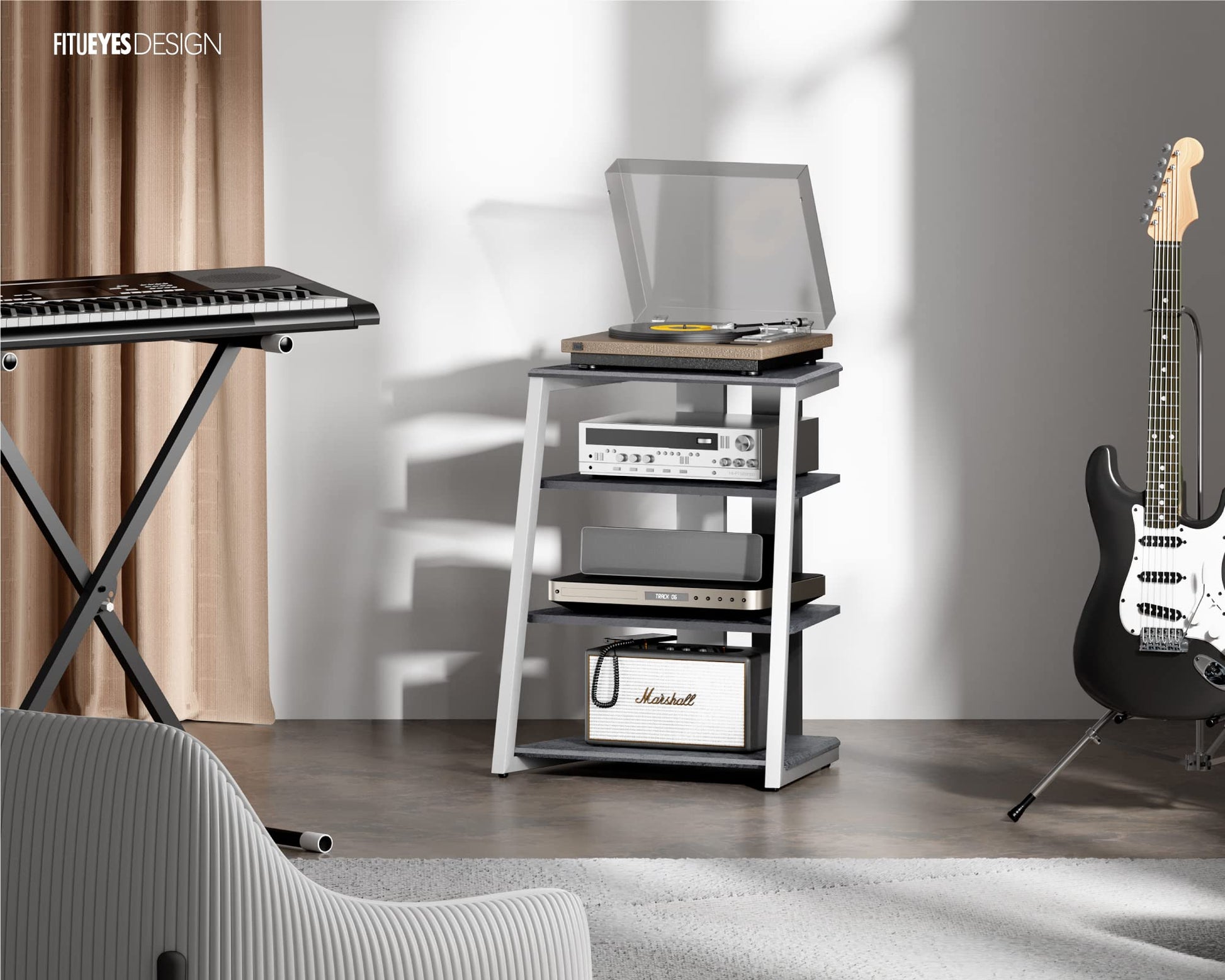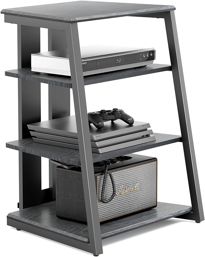 - The sizes of this 4-tier audio rack is 24” x 20.4” x 30.6” (L x W x H), convenient heat dissipation, and designed with 2 freely adjustable laminates height, can fits better with your audio-visual equipment, TV accessories, and sound bar, woofer, DVD player, game console, Blu-ray player, PS4, Xbox One, cable box, amplifier, Speakers, record players, etc. The top shelf can also support certain LCD / LED flat panel TVs.
