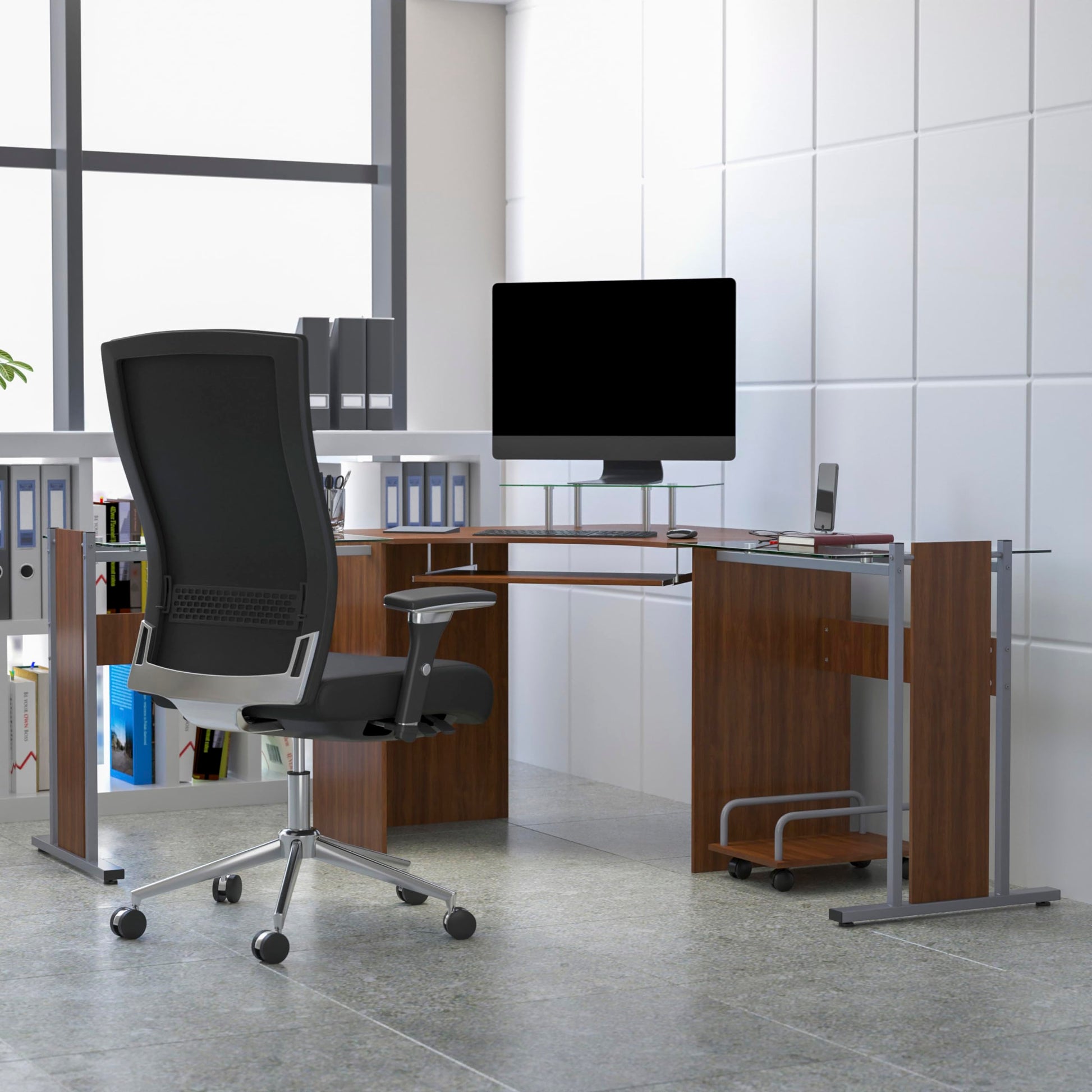 - Bring organization and function to any space while maintaining your impeccable sense of style. This rich mahogany finish desk with sleek frosted glass work surfaces and monitor platform makes productivity look amazing