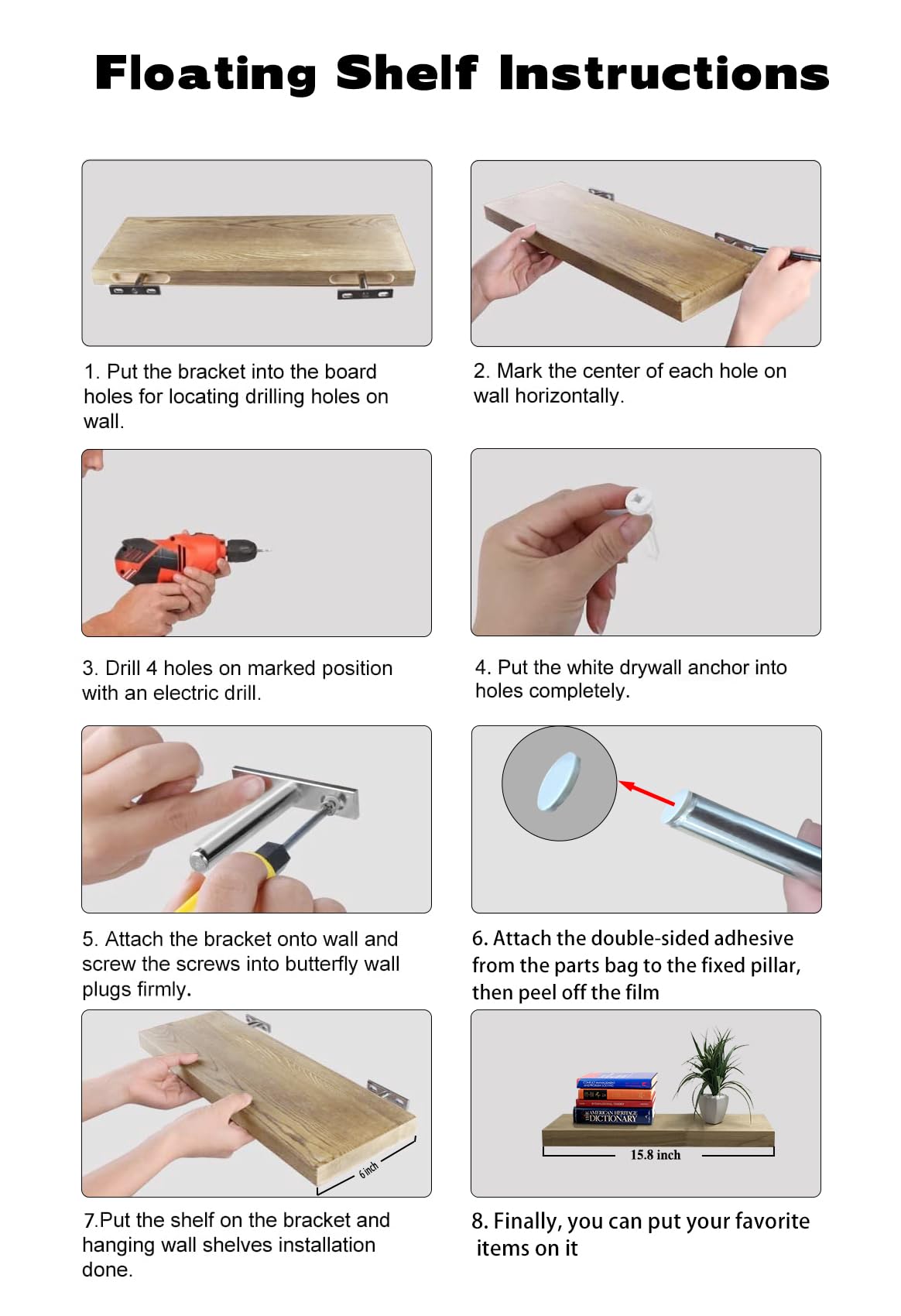 - 100% SOLID WOOD MATERIAL : Floating Shelves are handcrafted from thick, natural solid wood, each with its own unique character of knots and natural brown wood grain, adding aesthetic appeal to any home decor style.