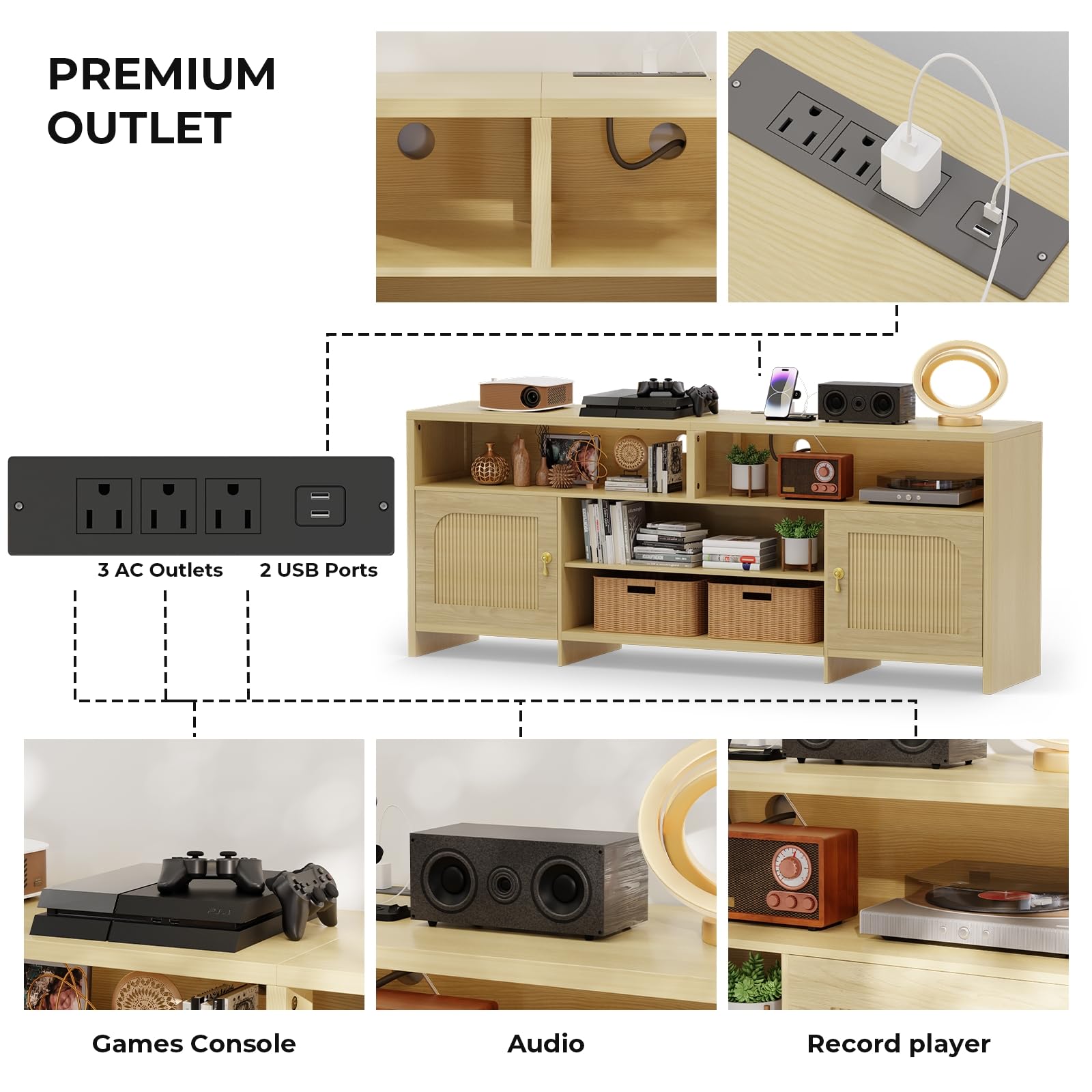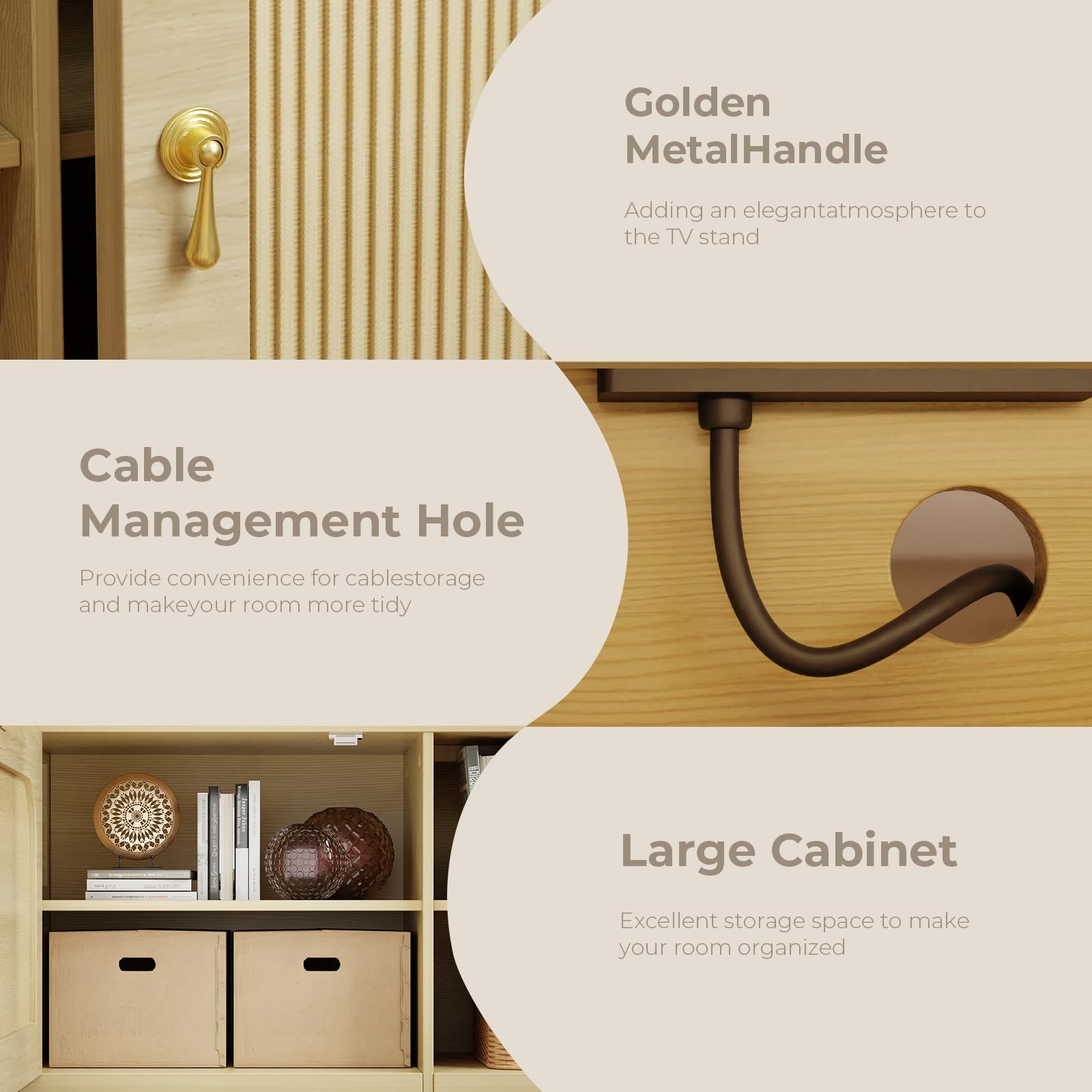 Elevate your living room with this sophisticated fluted TV stand, designed to accommodate large televisions from 70 to 85 inches. The natural oak finish and distinctive blister door design create a stunning focal point while providing practical storage and entertainment solutions.