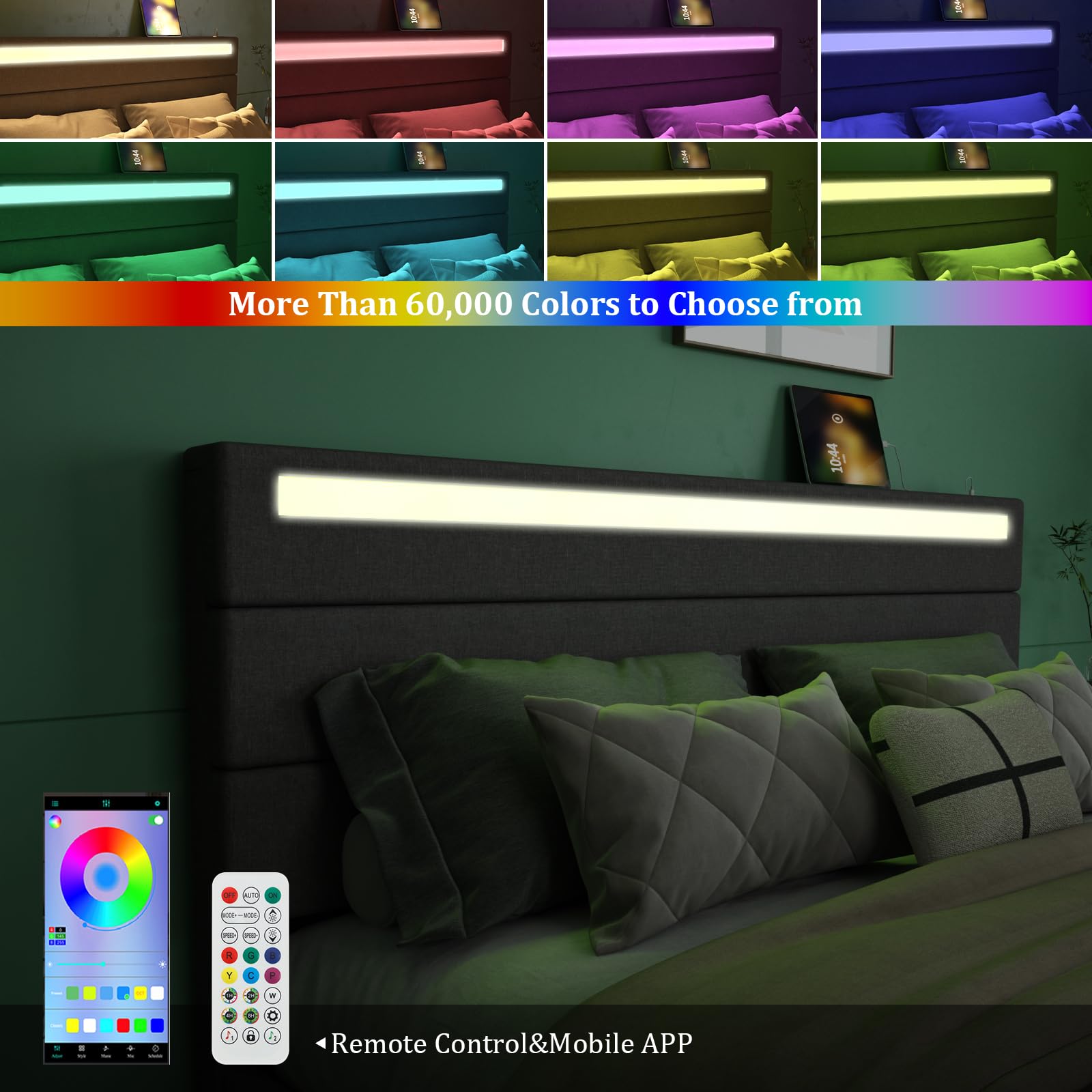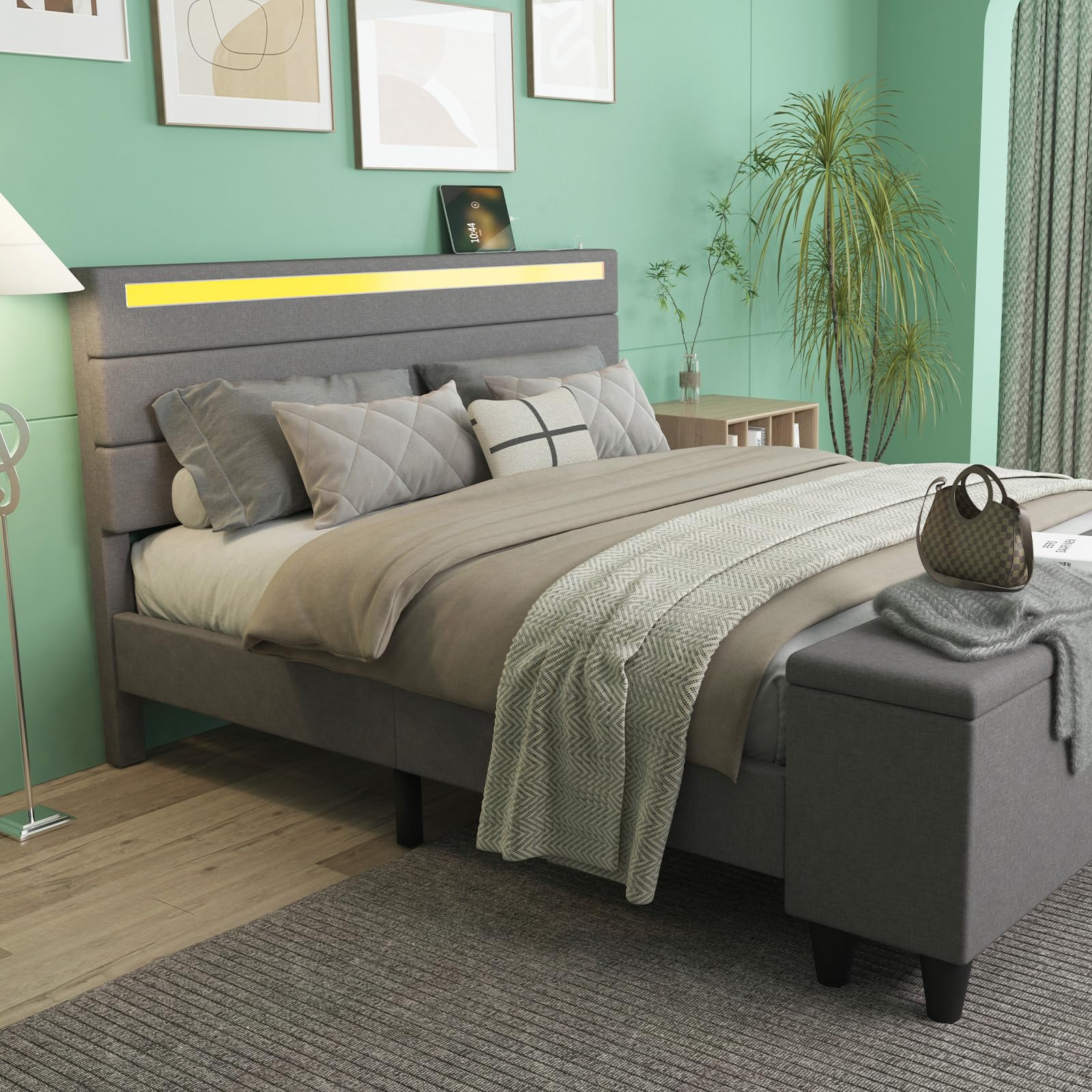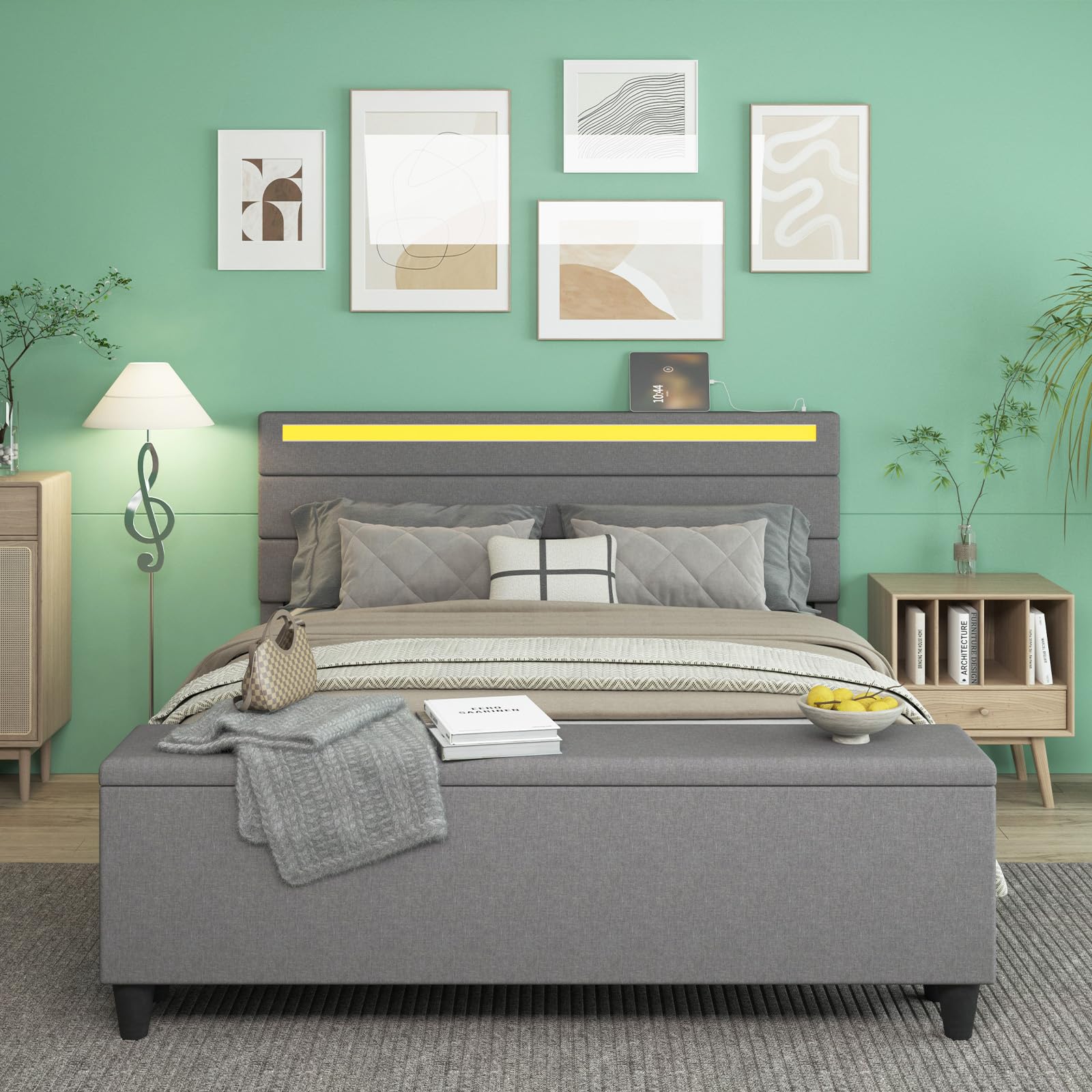 Forrise Queen Bed Frame with Headboard, USB Charging Station and LED Light, Footstool, Upholstered Platform Bed Frame with Living Space, Wood Slat Support, Solid Wood, Gray