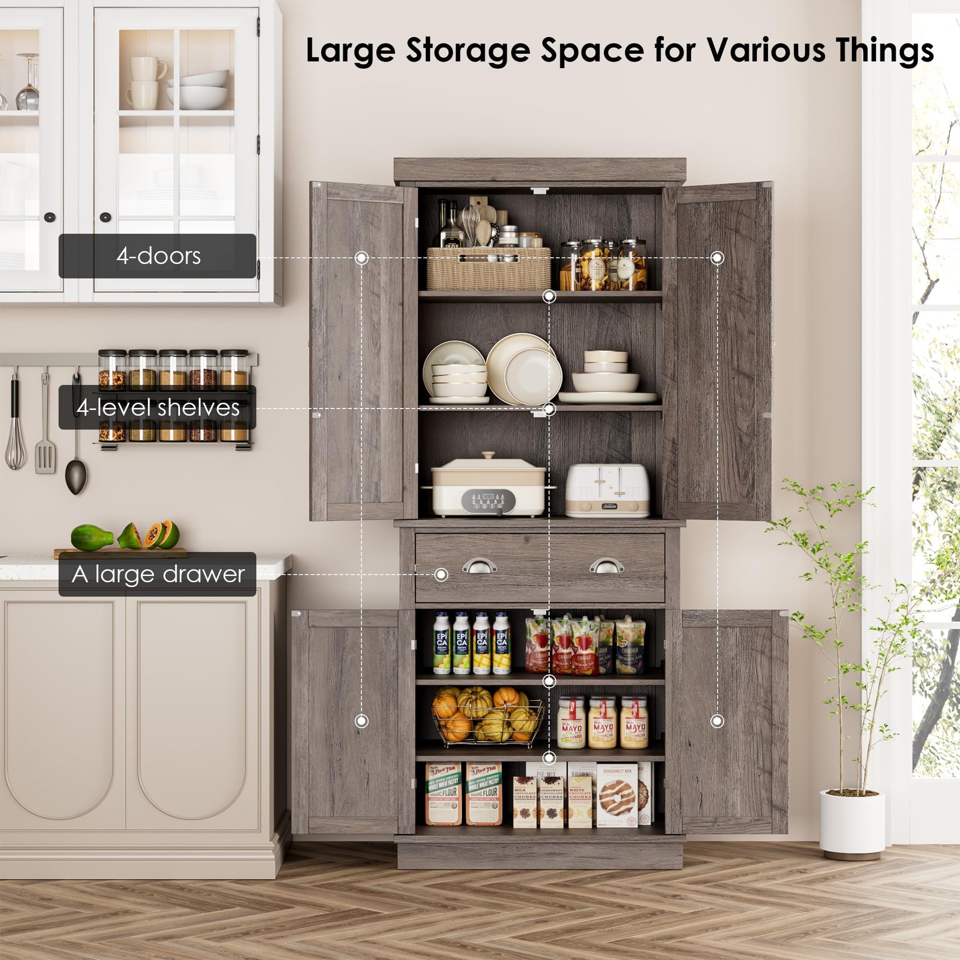 FOTOSOK 72" Kitchen Pantry Storage Cabinets with Drawer, Freestanding Cupboard with 4 Doors, Drawer, 4 Shelves, Utility Pantry Cabinet for Kitchen, Dining Room, Living Room, Ash Grey