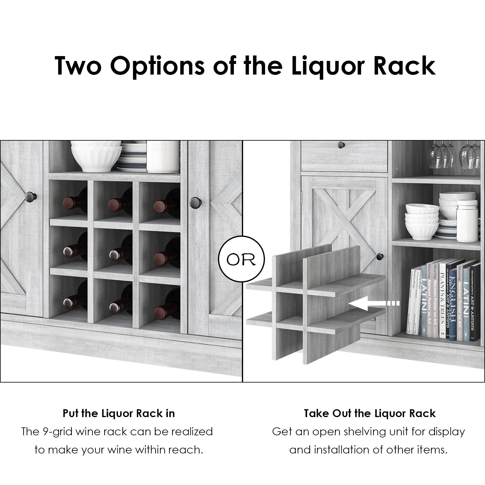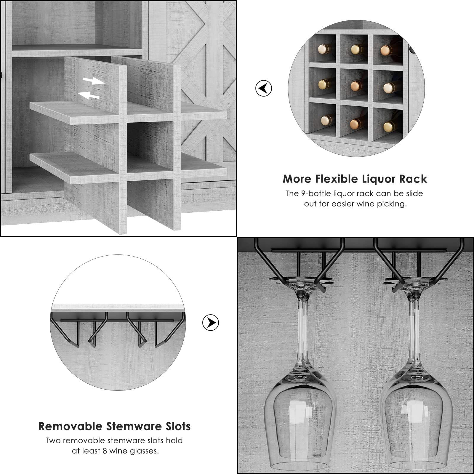 - MORE FLEXIBLE -- This wine bar cabinet for liquor and glasses has 2 removable wine glass racks and a removable 9-compartment wine rack. You can store different sizes of items by the buffet storage cabinet depending on your needs. If you need more storage space, you can take out the 9-compartment wine rack for more convenience for your daily use.